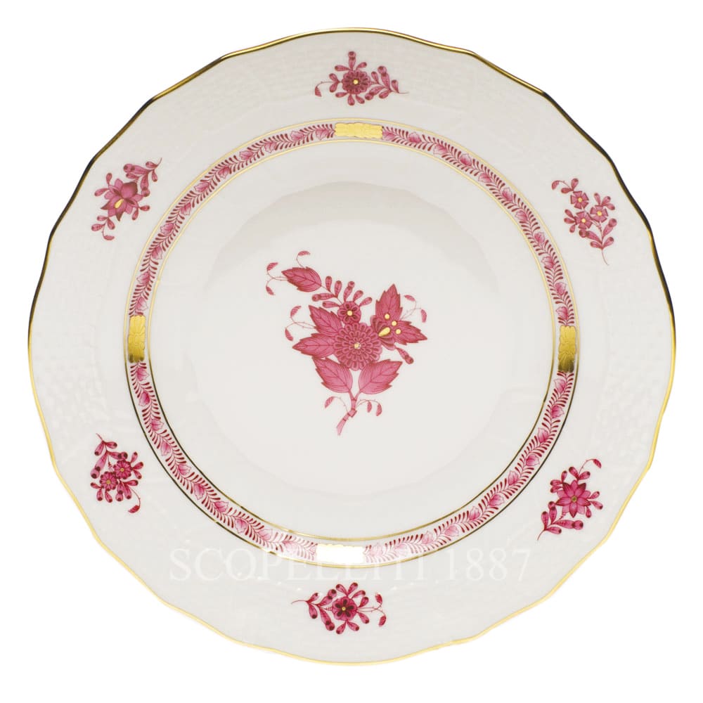 Herend hand painted Dessert Plate 01521-0-00 AP Apponyi Pink Form: Rocaille 1 pc – Ø 23 cm h 2,4 cm (8.25″D x 0.94″H) We are official distributor of Herend Porcelain, that is the world famous Porcelain Manufactory, operating for over 180 years. Herend is synonymous for unique, hand painted, master crafted porcelain. Apponyi, one Herend Porcelain Manufactory’s most renowned décors, was developed starting from the Fleur des Indes décor. In the centre of the plate it is possible to see a motif of a peony encompassed by leaves. A garland of stylized leaves runs all around the edge of the well and it is interrupted periodically by carved gilded rosettes. The ledge shows the contoured pattern of a flower surrounded by six leaves with a decoration of brilliant specks of gold.