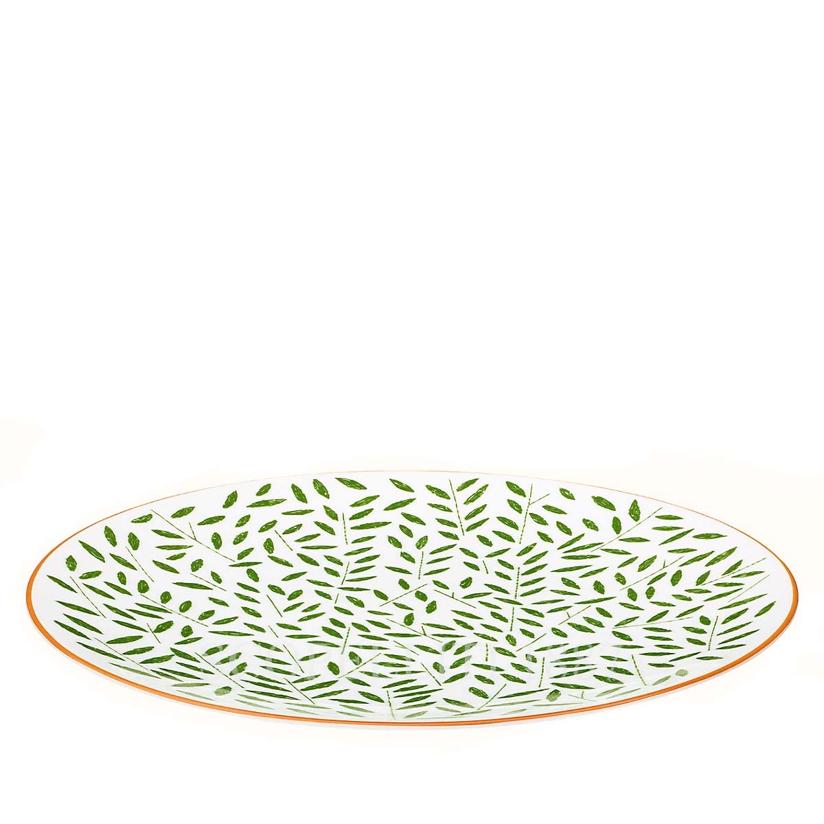 Hermes A Walk in the Garden Dinner Plate Green in porcelain, complete with a Hermès gift box, Bolduc ribbon, and the iconic orange Hermès shopping bag. It features vibrant botanical elements in green, that evoke the freshness of blades of grass or delicate foliage. The orange rim adds a bold and sophisticated accent, creating a harmonious contrast to the nature-inspired design. Experience the elegance of the Hermes A Walk in the Garden Dinner Plate Green and bring a touch of garden-inspired beauty to your table setting.