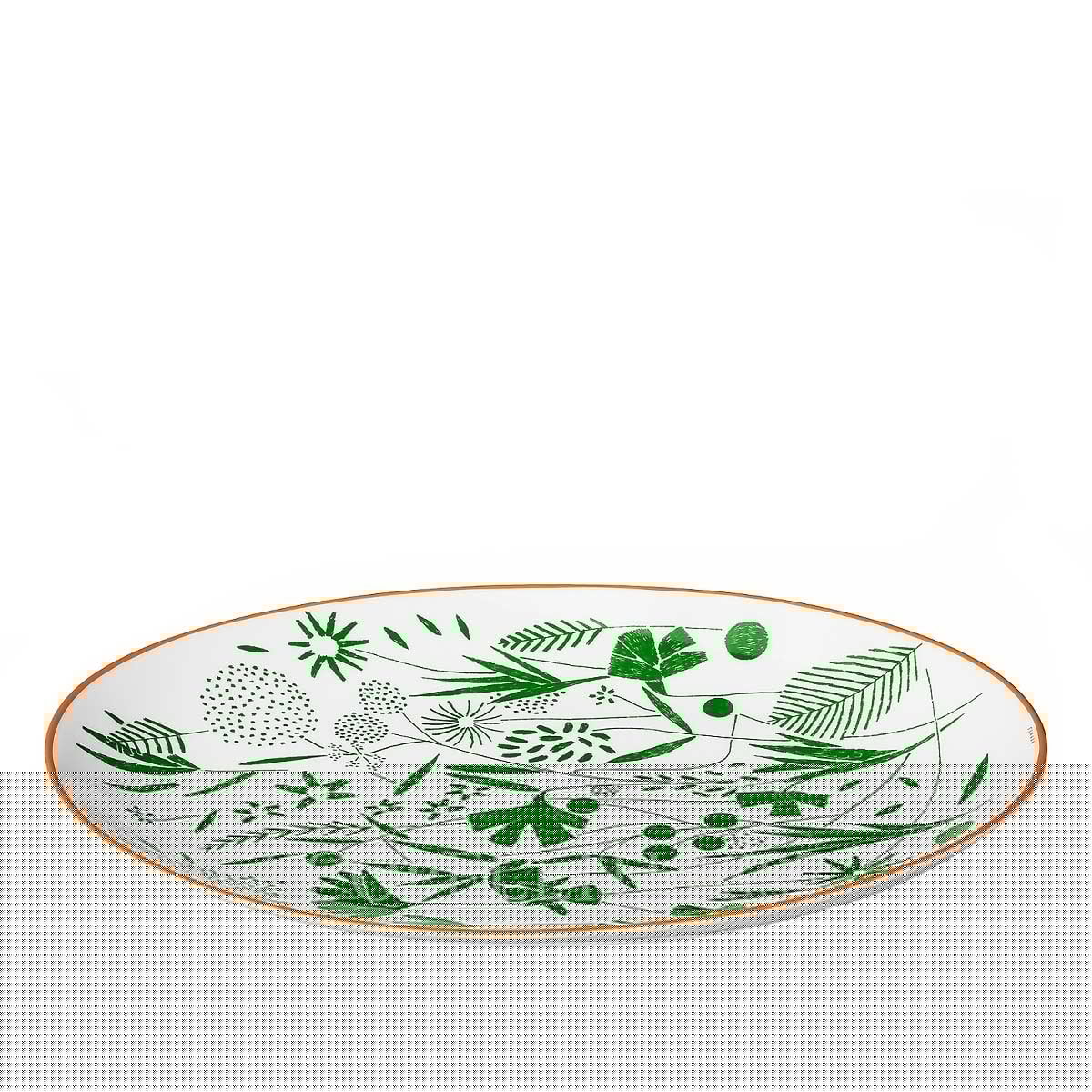 Hermes A Walk in the Garden Oval Platter in porcelain, complete with a Hermès gift box, Bolduc ribbon, and the iconic orange Hermès shopping bag. This Hermès platter features a vibrant design inspired by nature. The design showcases a scattered green leaf motif, interspersed with flower-like accents and botanical elements. The design is bordered with a thin orange rim for added contrast. Experience the elegance of the Hermes A Walk in the Garden Oval Platter and bring a touch of garden-inspired beauty to your table setting.