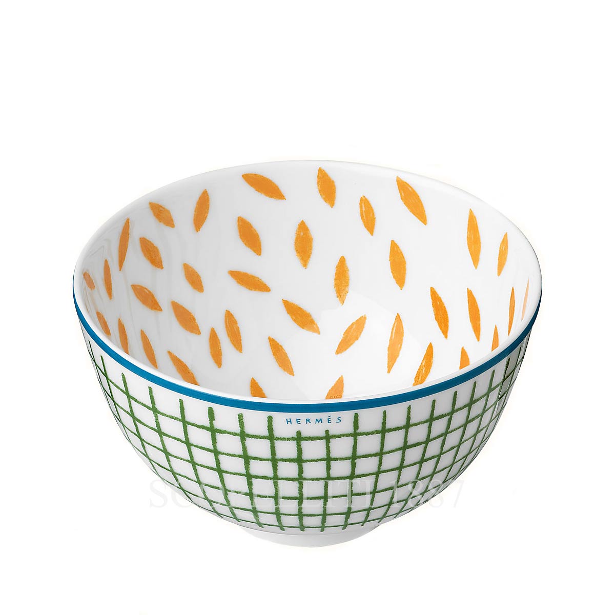 Hermès A walk in the garden Small Bowl in porcelain, complete with a Hermès gift box, Bolduc ribbon, and the iconic orange Hermès shopping bag. This Hermès bowl features a vibrant design inspired by nature. The interior showcases a scattered orange leaf motif, while the exterior has a geometric grid pattern in green. The design is bordered with a thin blue rim for added contrast. Experience the elegance of the Hermès A Walk in the Garden Small Bowland bring a touch of garden-inspired beauty to your table setting.