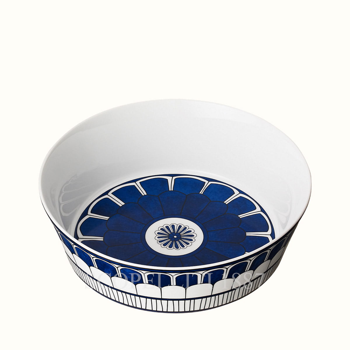 This Hermes Baking Dish Bleus d’Ailleurs features a detailed blue and white design. In the center, there is a floral pattern with petals in dark blue. The overall design is very elegant, blending classic and modern styles.