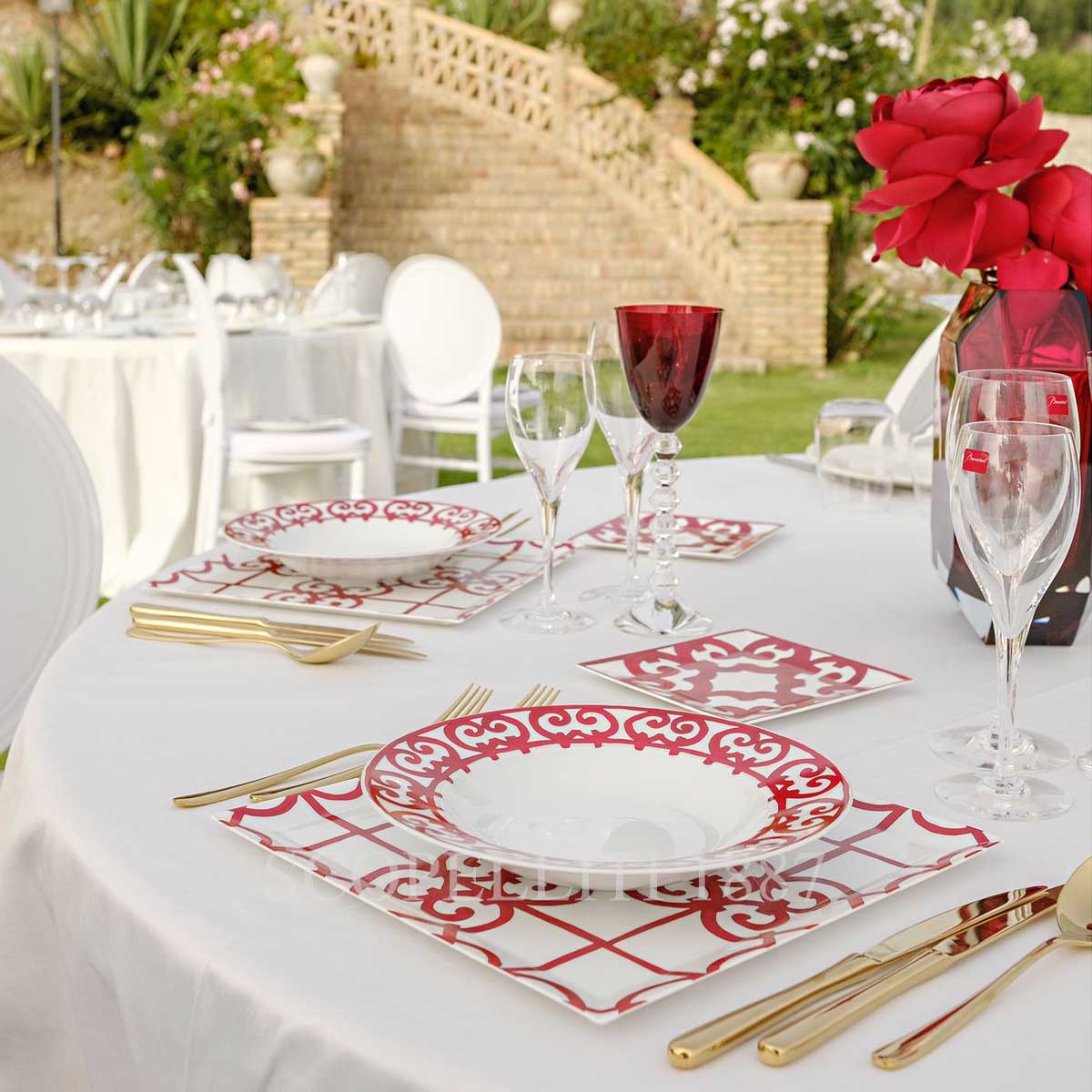 The Balcon du Guadalquivir Hermes dinnerware collection is one of the classiest from the whole range of the brand. Inspired by the stunning ironwork seen on balconies in Andalusia, Spain, this vibrant collection consists of 47 pieces designed for all dining moments like lunch, dinner, tea, coffee, and home decorations. The design of Hermes Square Plate Balcon du Guadalquivir like every other piece is graceful with strong geometric red shapes and flowing curves on the Limoges porcelain that create a harmonious blend of classic and modern styles. The red color gives it a lively, Spanish flair, while each piece works together to bring sophistication and energy to any table setting.