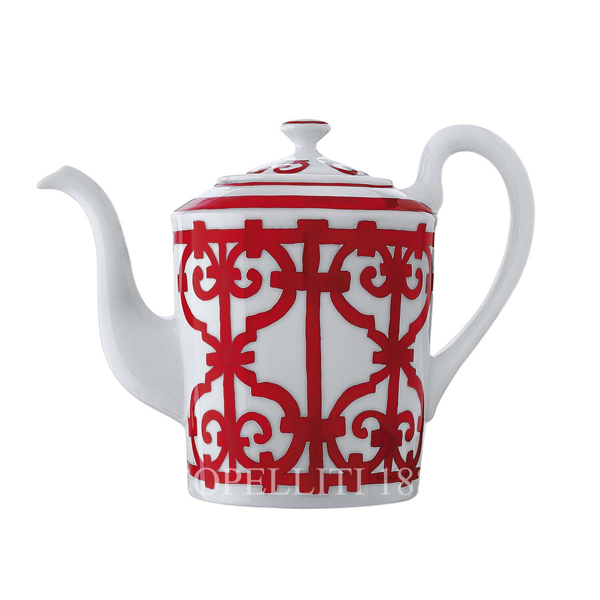 Hermes Balcon du Guadalquivir Teapot in porcelain, complete with a Hermès gift box, Bolduc ribbon, and the iconic orange Hermès shopping bag. This Hermes creation has a red motif of interlocking lines and curves, set against a clean white background. Its decorative pattern resembles elegant ironwork seen in traditional Spanish architecture. The design is classic and eye-catching, perfect for enhancing any meal setting. Experience the elegance of the Hermes Balcon du Guadalquivir Teapot, a beautiful addition to any collection or a perfect luxury gift for someone special.