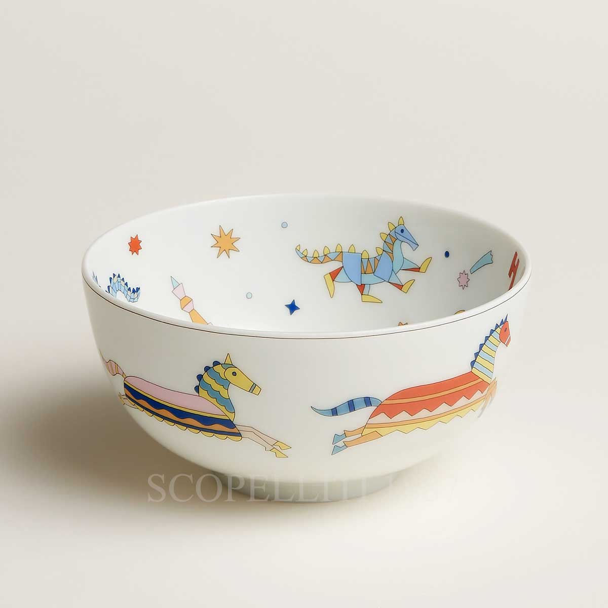 Hermes Bowl Epopee is beautifully crafted porcelain item, perfect for enhancing your children’s tableware collection. The Epopée design by Jan Bajtlik takes us into a magical world full of horses, unicorns, and dragons. These creatures, both real and mythical, explore a fantasy land with snowy mountains, grand castles, enchanted forests, and rivers. The design is colorful and detailed, telling a fun and imaginative story.