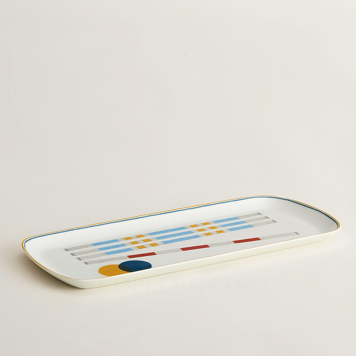 The porcelain pieces are adorned with hand-applied screen-printed decorations, showing narrative and abstract motifs inspired by the excitement of the Saut Hermès event. These designs, in muted shades of blue, yellow, and red, depict elements such as horses, saddles, and obstacles, reflecting Hermès’ deep-rooted connection to equestrian culture.