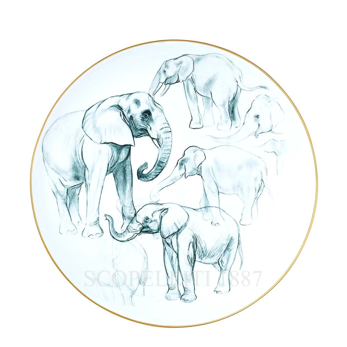 Hermes Carnets d’Equateur Large Centerpiece features a detailed design of elephants. Depicted in green tones, they appear to be cautiously surrounded by green delicate greenish background. The plate has a refined and elegant feel, with soft, naturalistic brushstrokes and a color palette dominated by white, green, and gold. The rim is subtly accented with a thin gold trim, adding a luxurious touch. It feels like a visual story or journey, combining the elegance of Hermès with a sense of energy, capturing the spirit of distant lands maintaining a refined, timeless aesthetic. Hermes Carnets d’Equateur Large Centerpiece is a truly artistic piece, blending luxury with a touch of wanderlust. The Hermes Carnets d’Equateur Large Centerpiece comes beautifully presented in an elegant Hermès gift box, adorned with the signature Bolduc ribbon and accompanied by the iconic orange Hermès shopping bag, making it a perfect gift or collector’s piece.