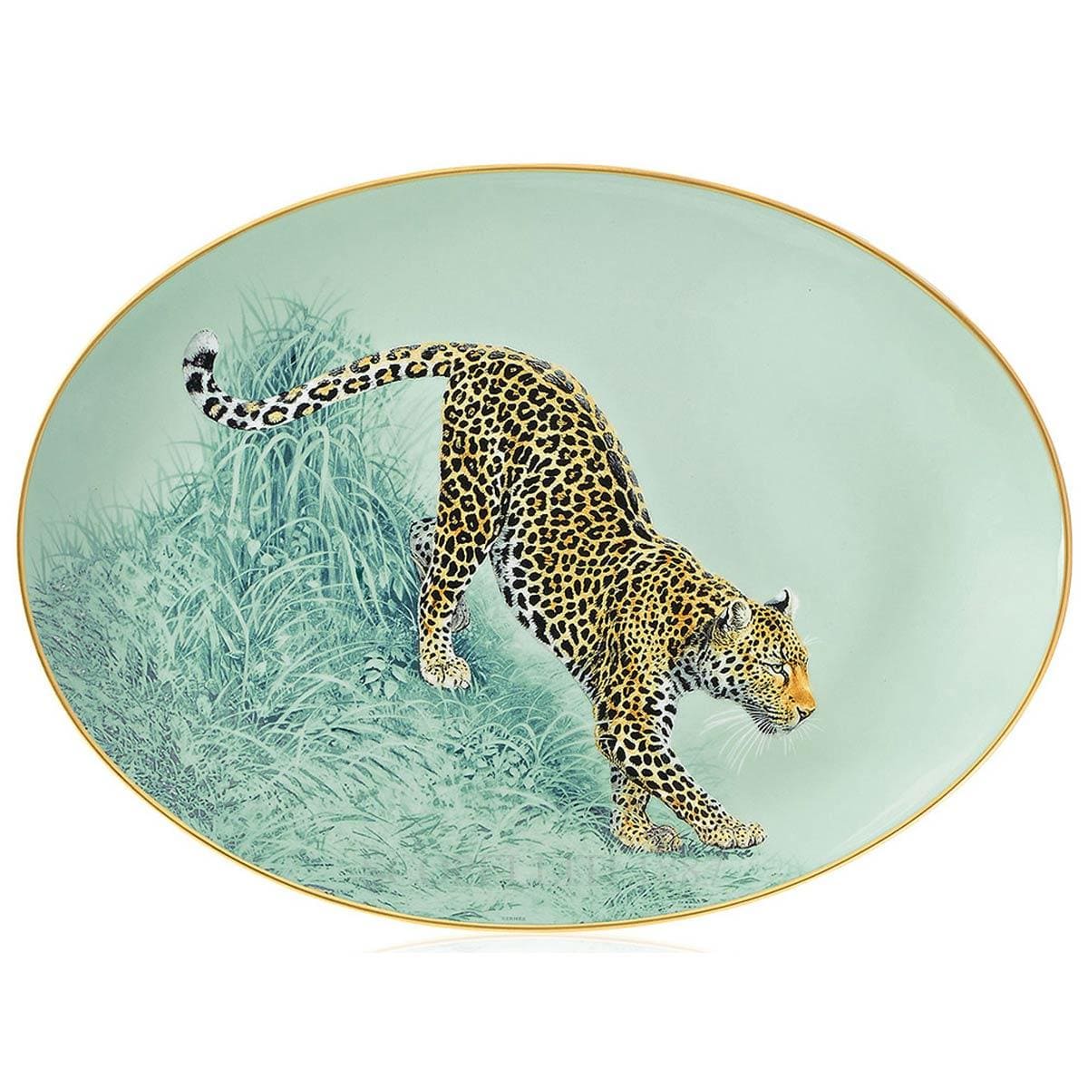 Hermes Carnets d’Equateur Oval Platter Small features a delicate design of jaguar in a lush, tropical setting. Depicted in rich golden and brown tones with detailed spots, it appears to be cautiously surrounded by green foliage. The plate has a refined and elegant feel, with soft, naturalistic brushstrokes and a color palette dominated by white, green, and gold. The rim is subtly accented with a thin gold trim, adding a luxurious touch. It feels like a visual story or journey, combining the elegance of Hermès with a sense of energy, capturing the spirit of distant lands maintaining a refined, timeless aesthetic. Hermes Carnets d’Equateur Oval Platter Small like a truly artistic piece, blending luxury with a touch of wanderlust. The Hermes Carnets d’Equateur Oval Platter Small comes beautifully presented in an elegant Hermès gift box, adorned with the signature Bolduc ribbon and accompanied by the iconic orange Hermès shopping bag, making it a perfect gift or collector’s piece.