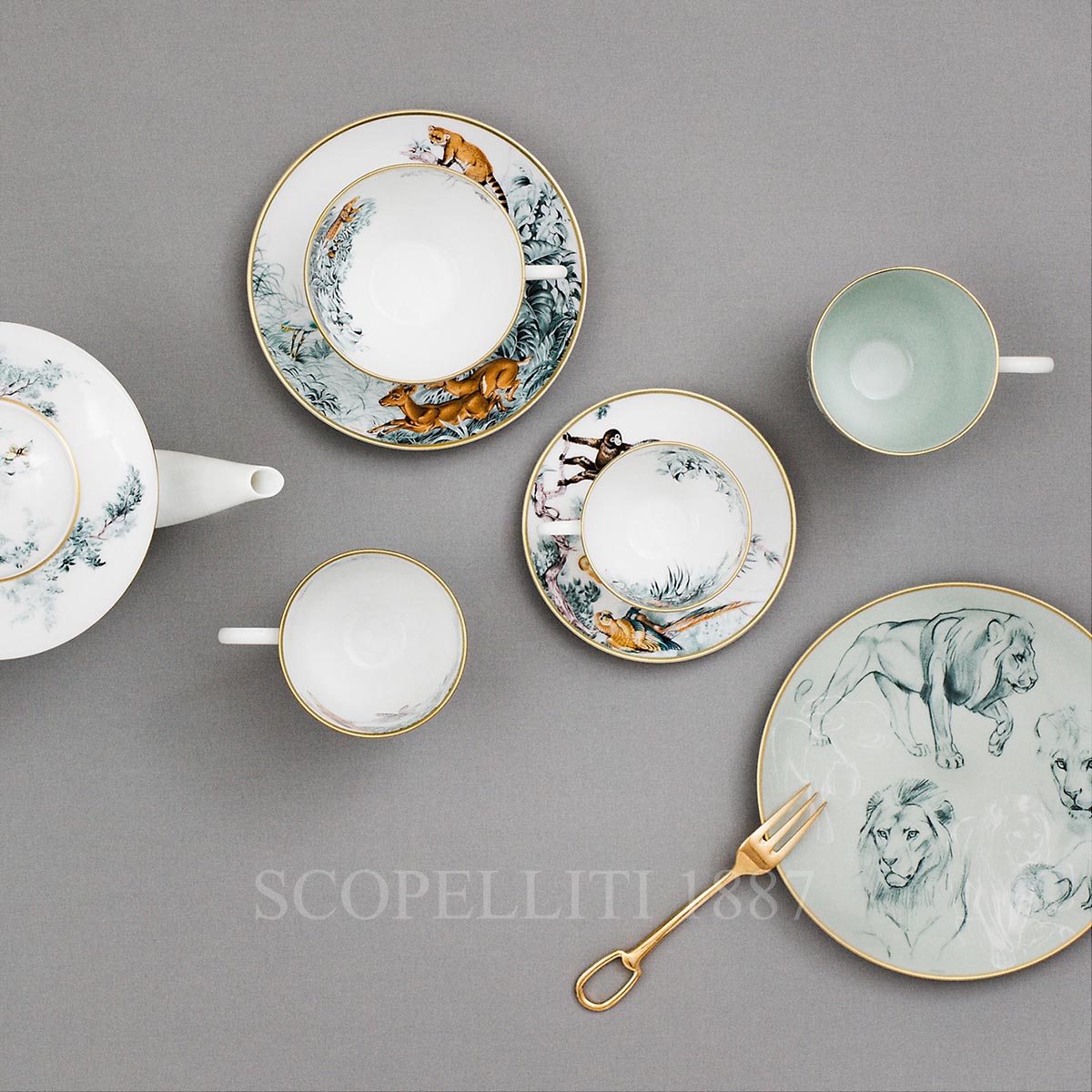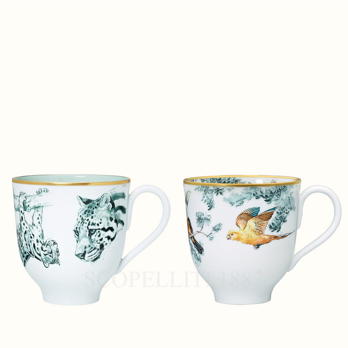 The Hermès Carnets d’Équateur Set of 2 Mugs is a luxurious gift that will impress anyone. Designed by the renowned artist Robert Dallet, this set is crafted with exceptional care in France. The mugs feature a beautiful nature-inspired design, capturing the vibrant spirit of the Carnets d’Équateur dinnerware collection. The set includes 2 porcelain mugs, each adorned with a unique Felines and Birds design. The decorations are screen-printed and applied by hand using gold thread, adding a touch of elegance to the pieces. The two mugs in the set feature distinct yet complementary designs. One mug typically showcases felines, such as leopards or tigers, while the other features birds, often exotic species like parrots or falcons. Each mug tells its own part of a vibrant, nature-inspired story. The Hermès Carnets d’Equateur Set of 2 Mugs comes elegantly packaged in the original Hermès box, complete with the signature Hermès shopping bag. It is beautifully wrapped with the iconic Hermès ribbon, making it the perfect gift presentation. With a generous capacity of 42 cl and standing 10 cm tall, these mugs are both functional and stylish, bringing timeless elegance to your daily rituals. Whether you’re enjoying a hot beverage or gifting a loved one, the Hermès Carnets d’Equateur Mugs make a statement of refined taste and craftsmanship. Add a touch of luxury to your home with this exquisite set.