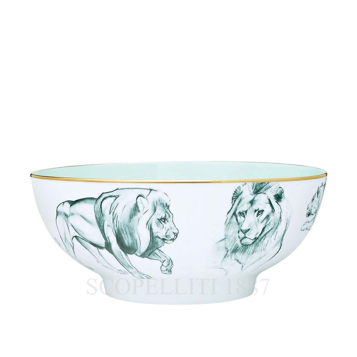 Hermes Carnets d’Equateur Small Salad Bowl with celadon interior features a delicate design of beautifully detailed lions, surrounded by green foliage. A fine gold trim encircles the bowl, enhancing its elegance and luxury. It feels like a visual story or journey, combining the elegance of Hermès with a sense of energy, capturing the spirit of distant lands maintaining a refined, timeless aesthetic. Hermes Carnets d’Equateur Small Salad Bowl Birds feels like a truly artistic piece, blending luxury with a touch of wanderlust. The Hermes Carnets d’Equateur Small Salad Bowl comes beautifully presented in an elegant Hermès gift box, adorned with the signature Bolduc ribbon and accompanied by the iconic orange Hermès shopping bag, making it a perfect gift or collector’s piece.