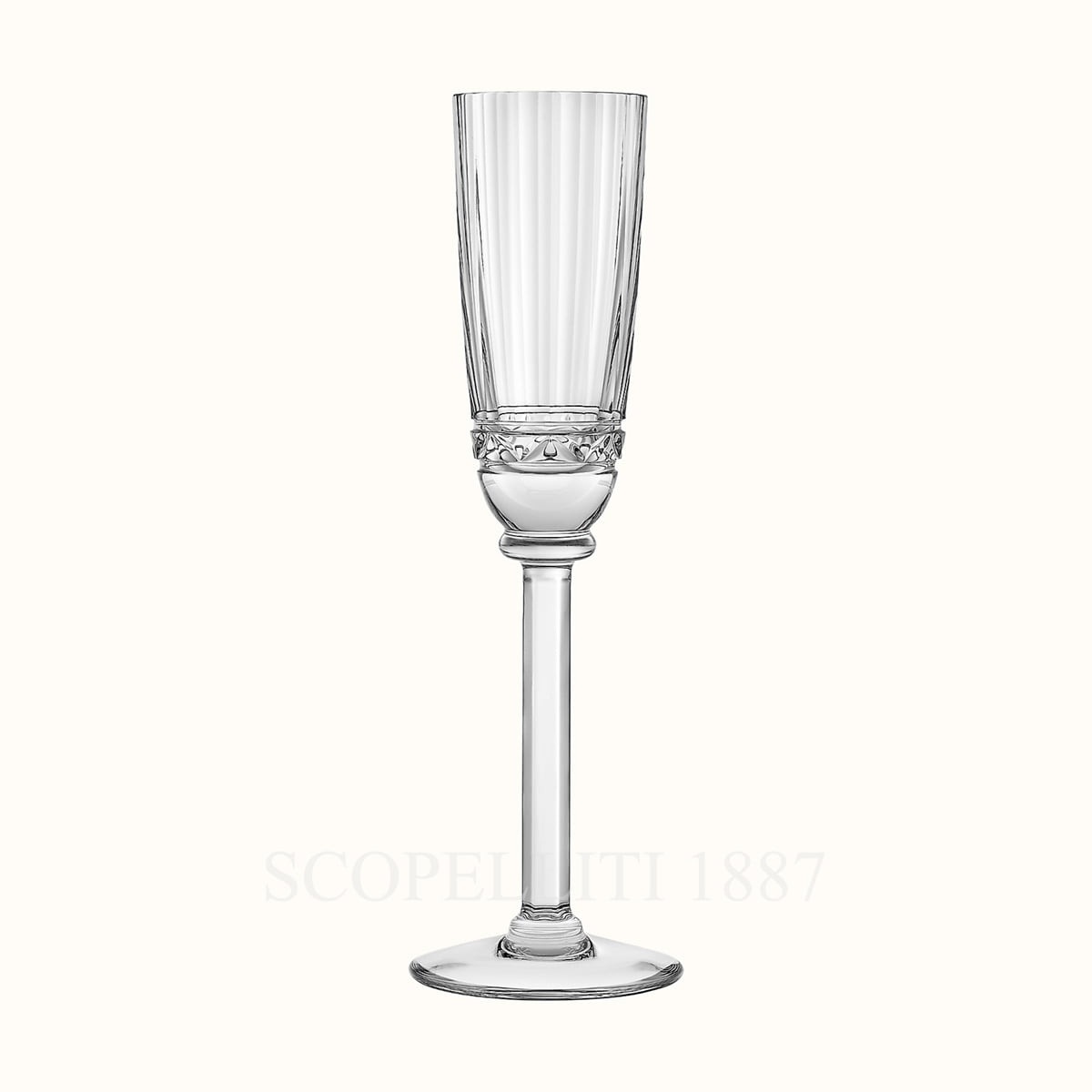The Hermes Crystal Champagne Flute Iskender features a refined, minimalist silhouette with a slightly tapered cylindrical shape on the long stem. The standout design element is the intricate detailing at the base, consisting of flat vertical cuts and diamond-shaped patterns, reminiscent of fine jewelry craftsmanship. This decorative touch enhances the way light refracts through the crystal, creating a mesmerizing brilliance.