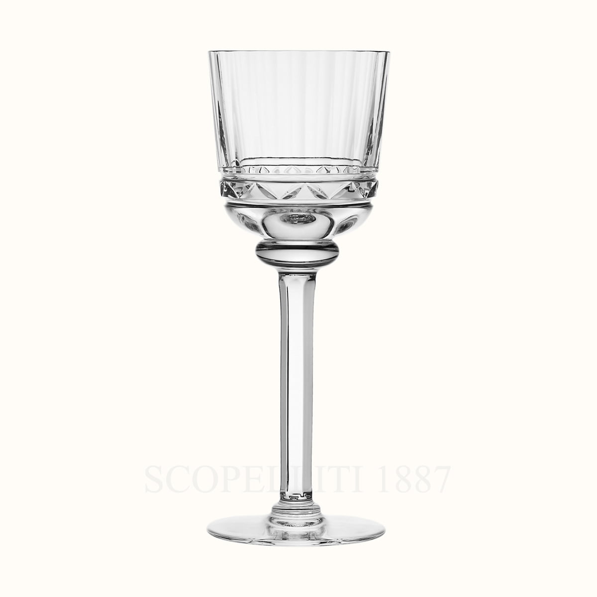 The Hermes Crystal Red Wine Glass Iskender features a refined, minimalist silhouette with a slightly tapered cylindrical shape on the long stem. The standout design element is the intricate detailing at the base, consisting of flat vertical cuts and diamond-shaped patterns, reminiscent of fine jewelry craftsmanship. This decorative touch enhances the way light refracts through the crystal, creating a mesmerizing brilliance.