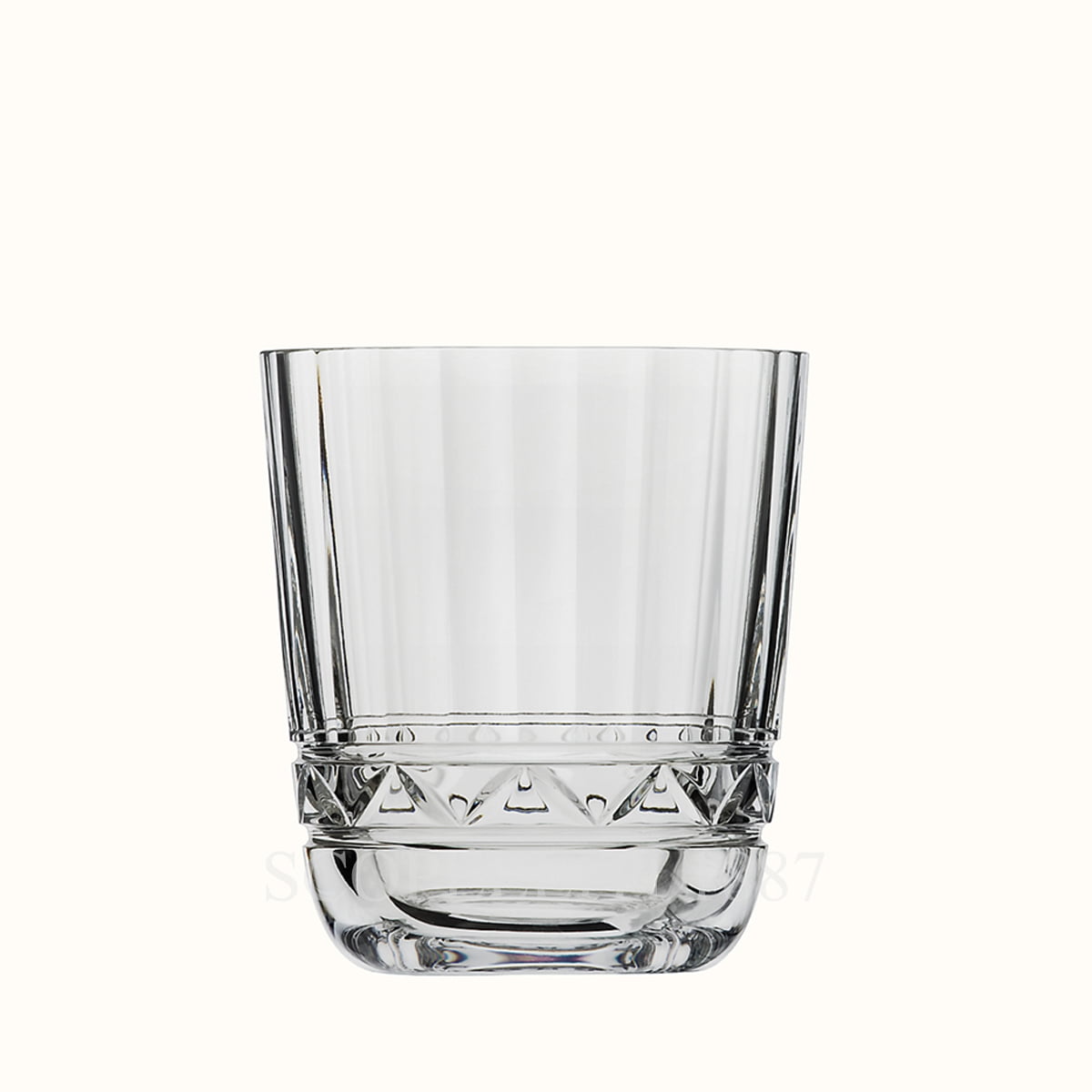 The Hermes Crystal Tumbler Iskender Large features a refined, minimalist silhouette with a slightly tapered cylindrical shape, both timeless and versatile. The standout design element is the intricate detailing at the base, consisting of flat vertical cuts and diamond-shaped patterns, reminiscent of fine jewelry craftsmanship. This decorative touch enhances the way light refracts through the crystal, creating a mesmerizing brilliance.
