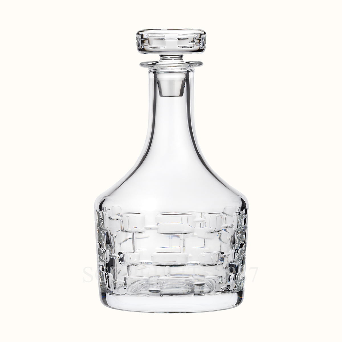 The Hermes Crystal Whisky Decanter Adage features a luxurious silhouette with a distinctive geometric pattern. The design consists of meticulously cut, stacked rectangular motifs that wrap around the lower half of the glass, creating a rhythmic, architectural aesthetic. The upper portion remains smooth and unadorned, offering a striking contrast that enhances the clarity and brilliance of the crystal. This refined Hermes Crystal Whisky Decanter Adage is a part of a high-end Hermes glassware collection, perfect for serving whiskey or other fine spirits with an air of sophistication. and elegance. The Hermes Crystal Whisky Decanter Adage comes beautifully presented in an elegant Hermès gift box, adorned with the signature Bolduc ribbon and accompanied by the iconic orange Hermès shopping bag, making it a perfect gift or collector’s piece.