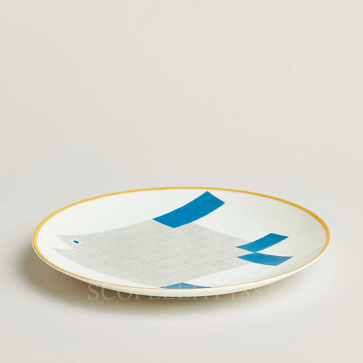 Hermes Dessert Plate Animaux Nattes Fish is beautifully crafted porcelain creation, perfect for enhancing your children’s tableware collection. The Animaux Nattés collection, designed by Tong Ren, is a playful and vibrant series featuring colorful depictions of animals such as giraffes, lobsters, turtles, butterflies, and fish. The designs are inspired by weaving patterns. Made in France, this collection is ideal for adding a cheerful, artistic touch to everyday moments for both kids and adults. The collection is versatile, including items like:
