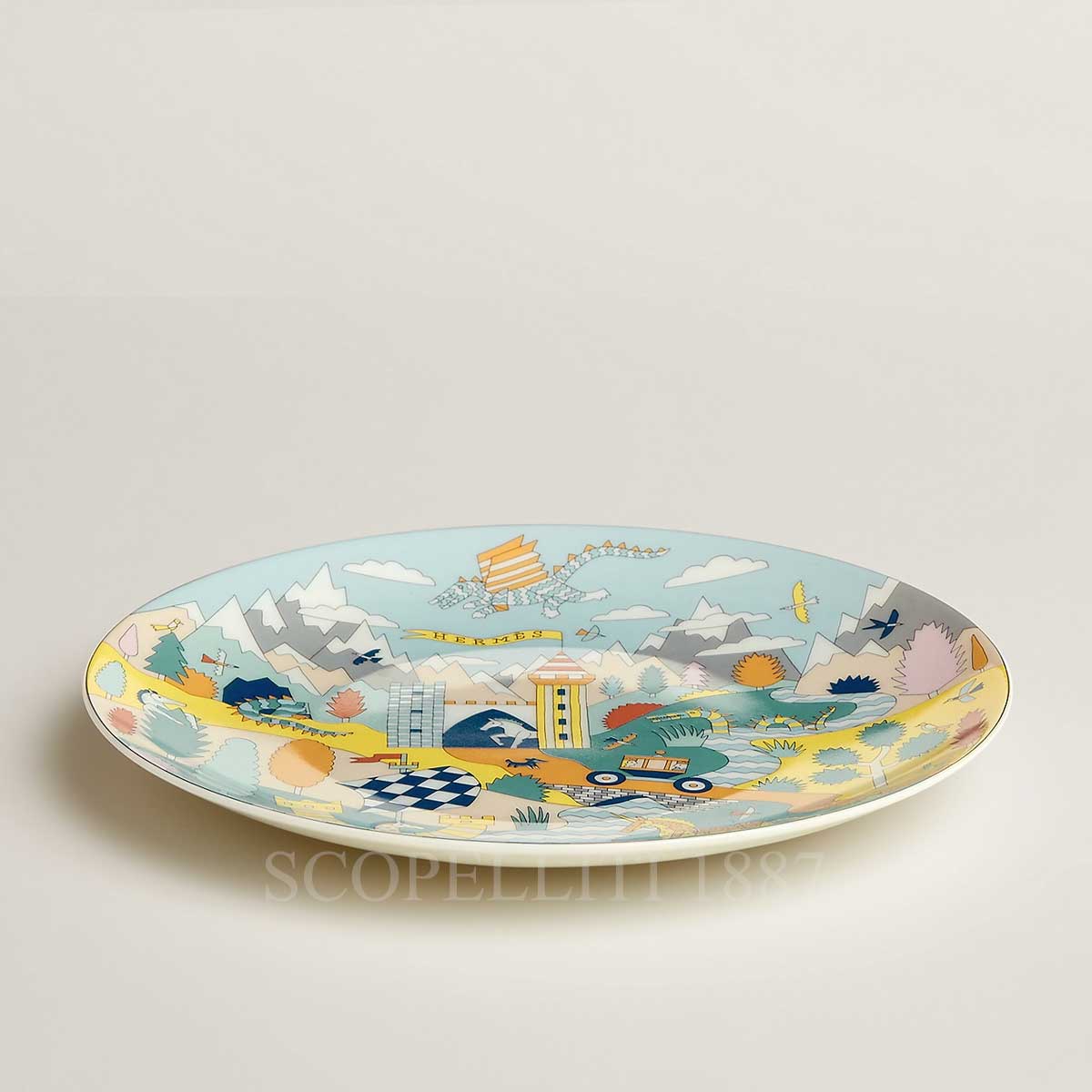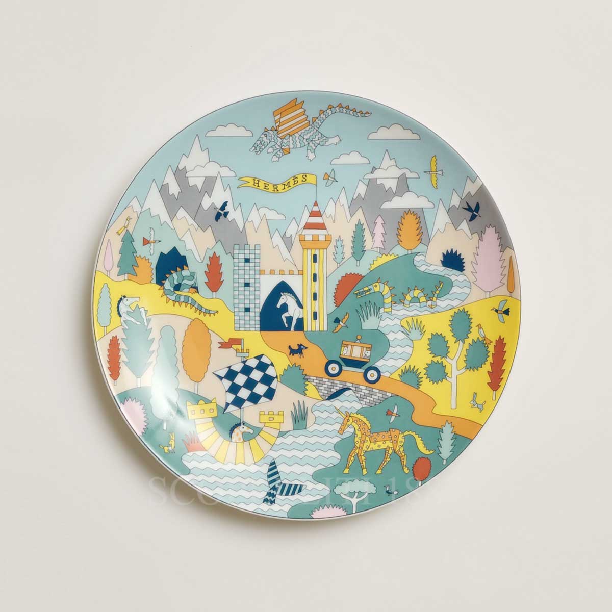 Hermes Dessert Plate Epopee is beautifully crafted porcelain item, perfect for enhancing your children’s tableware collection. The Epopée design by Jan Bajtlik takes us into a magical world full of horses, unicorns, and dragons. These creatures, both real and mythical, explore a fantasy land with snowy mountains, grand castles, enchanted forests, and rivers. The design is colorful and detailed, telling a fun and imaginative story.