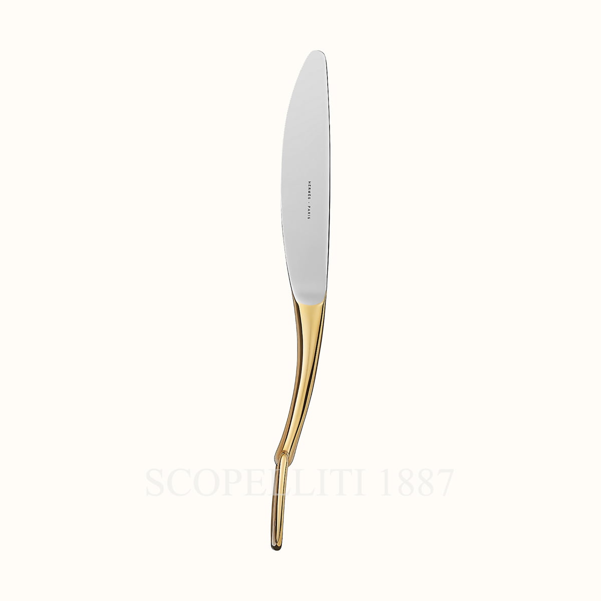 The Hermes Dinner Knife Grand Attelage Gold-Plated seamlessly merges timeless elegance with exceptional craftsmanship. Inspired by Hermès’ rich equestrian heritage, this exquisite piece embodies sophistication, making it a statement addition to any refined table setting. The Hermes Dinner Knife Grand Attelage Gold-Plated comes beautifully presented in an elegant Hermès gift paper bag, adorned with the signature Bolduc ribbon and accompanied by the iconic orange Hermès shopping bag, making it a perfect gift or collector’s piece. Expertly crafted from premium silver-plated metal, the Hermes Dinner Knife Grand Attelage Gold-Plated radiates a lustrous sheen, elevating both everyday dining and formal occasions. The ergonomically balanced handle, reminiscent of the saddle key used in traditional horse-drawn carriages, ensures comfort and grace with every use. Designed for those who appreciate luxury tableware, this gold-plated knife reflects the finest artistry in contemporary cutlery.