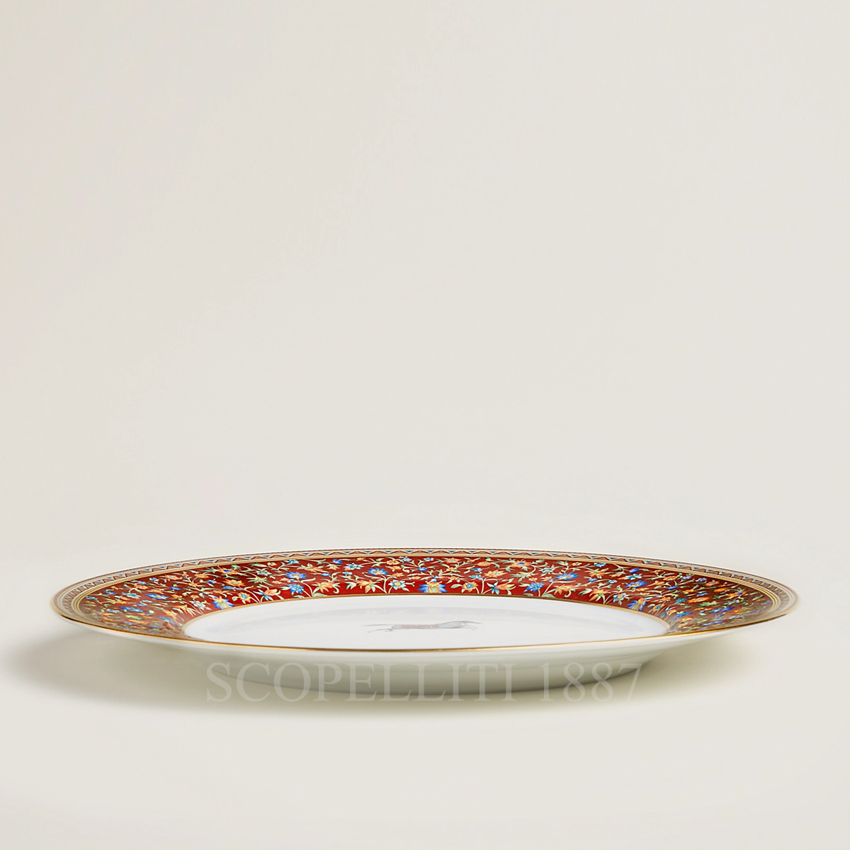 The Hermes dinner plate is made of porcelain with a detailed screen-printed decoration applied by hand. The plate has a bright red border with a detailed floral pattern in blue, yellow, and white. In the center of the plate, there’s a small, colorful horse. The border of the plate is patterned with a geometric thread in 24-carat gold. It appears elegant and finely crafted.