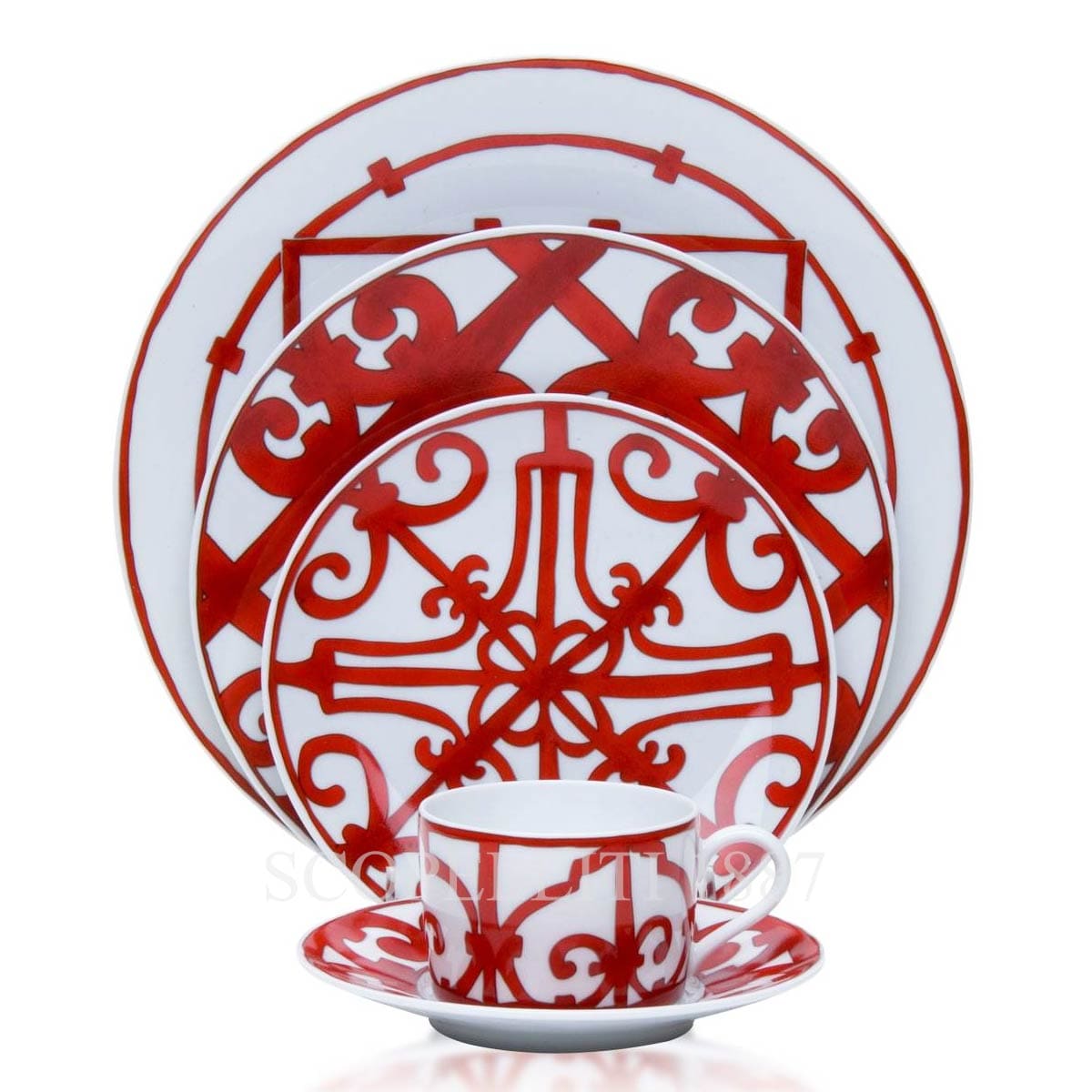 The Balcon du Guadalquivir Hermes dinnerware collection is one of the classiest from the whole range of the brand. Inspired by the stunning ironwork seen on balconies in Andalusia, Spain, this vibrant collection consists of 47 pieces designed for all dining moments like lunch, dinner, tea, coffee, and home decorations. The design of each piece is graceful with strong geometric red shapes and flowing curves on the Limoges porcelain that create a harmonious blend of classic and modern styles. The red color gives it a lively, Spanish flair, while each piece works together to bring sophistication and energy to any table setting.