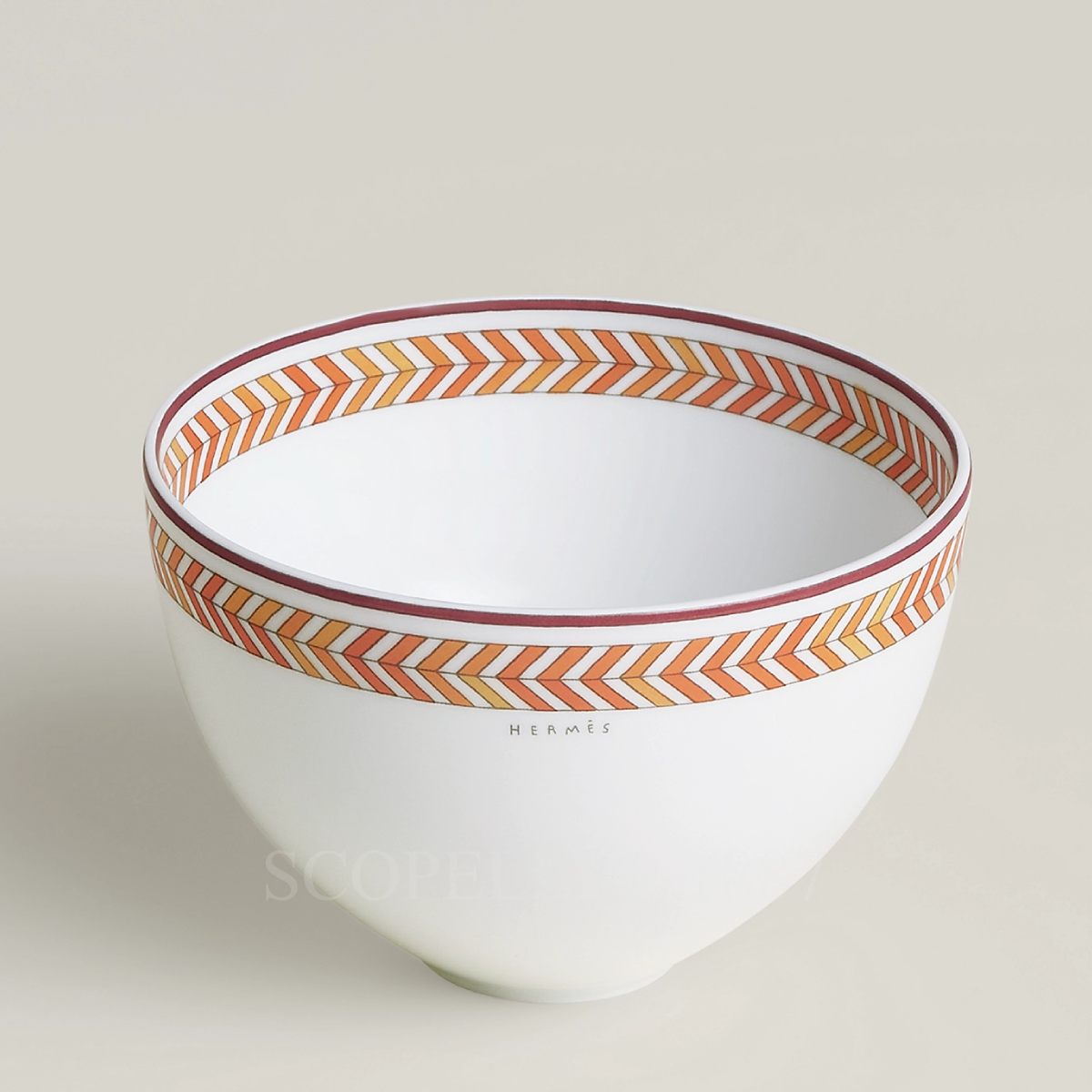 A sculptural Hermes en Contrepoint Bowl Medium High is crafted in Hermès Limoges porcelain and decorated using hand-laid chromolithography printing. Designed by Nigel Peake, its elevated silhouette and vibrant border introduce depth and rhythm to the table. Made in France, it is presented in a Hermès gift box, finished with the signature Bolduc ribbon and accompanied by the iconic orange shopping bag.