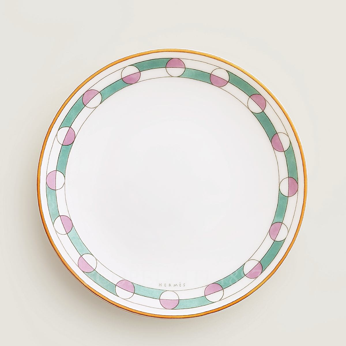 The Hermès en Contrepoint Bread Plate n.1 combines clean lines with a touch of color. Crafted from fine Limoges porcelain and decorated using hand-laid chromolithography printing, it offers a refined canvas for the collection’s signature geometric friezes.