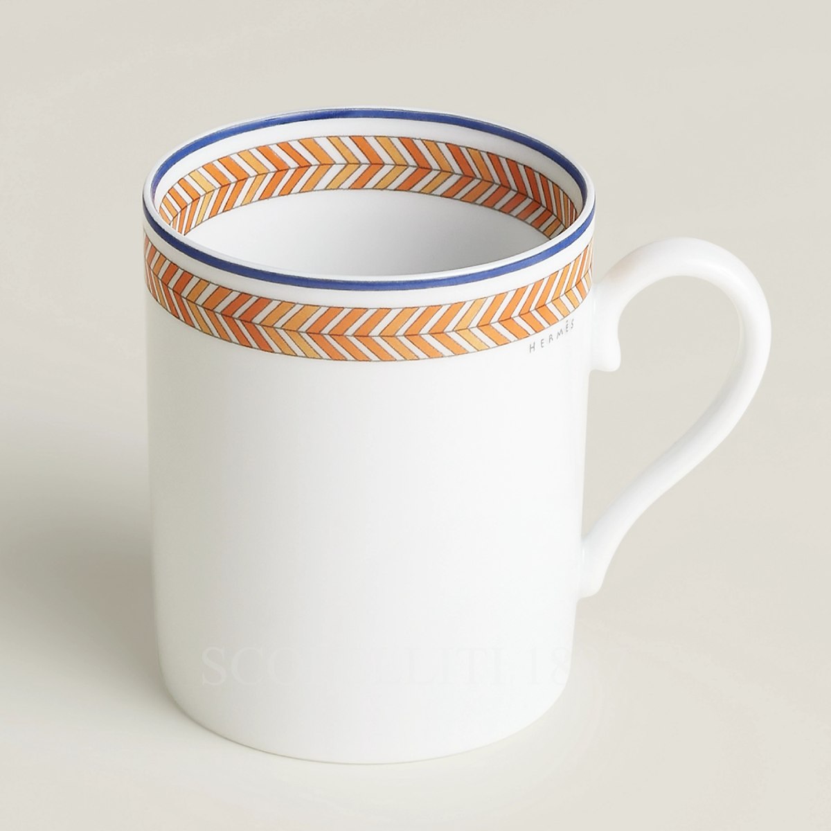 The Hermes en Contrepoint Mug n.2 is crafted in fine Hermès Limoges porcelain and adorned with hand-laid chromolithography printing. Conceived by Nigel Peake, its graphic composition highlights the collection’s interplay of line and color. Made in France, it arrives in a Hermès gift box, finished with the signature Bolduc ribbon and accompanied by the iconic orange shopping bag.