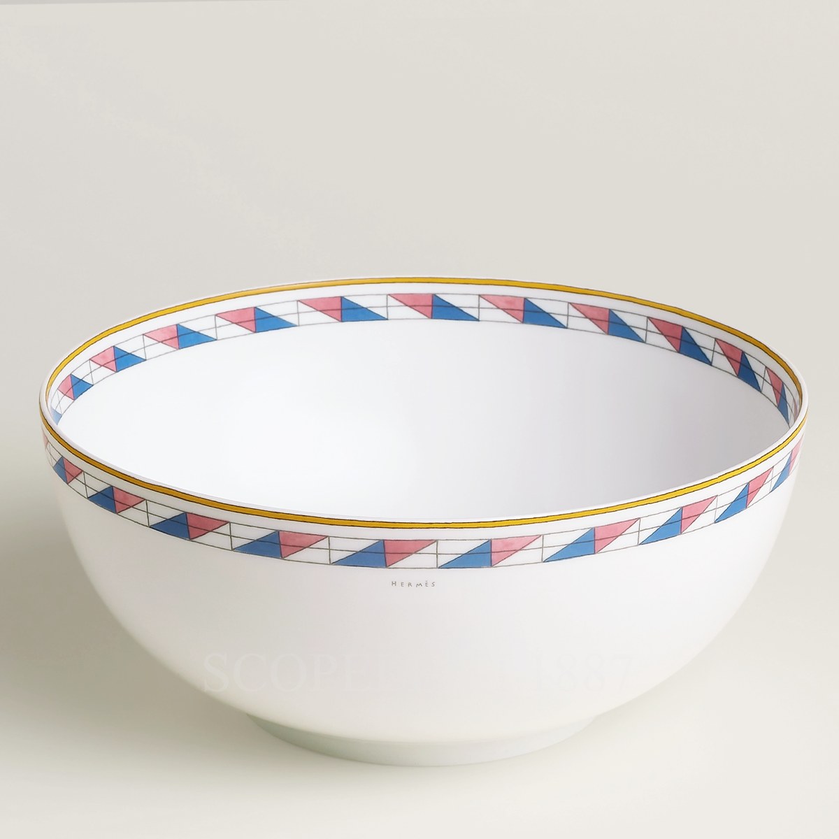 A sculptural presence for the contemporary table, the Hermès en Contrepoint salad bowl large combines generous proportions with a vibrant graphic identity. Fine Limoges porcelain is enlivened by hand-laid chromolithographic decoration, where layered friezes and chromatic accents create a refined visual rhythm.