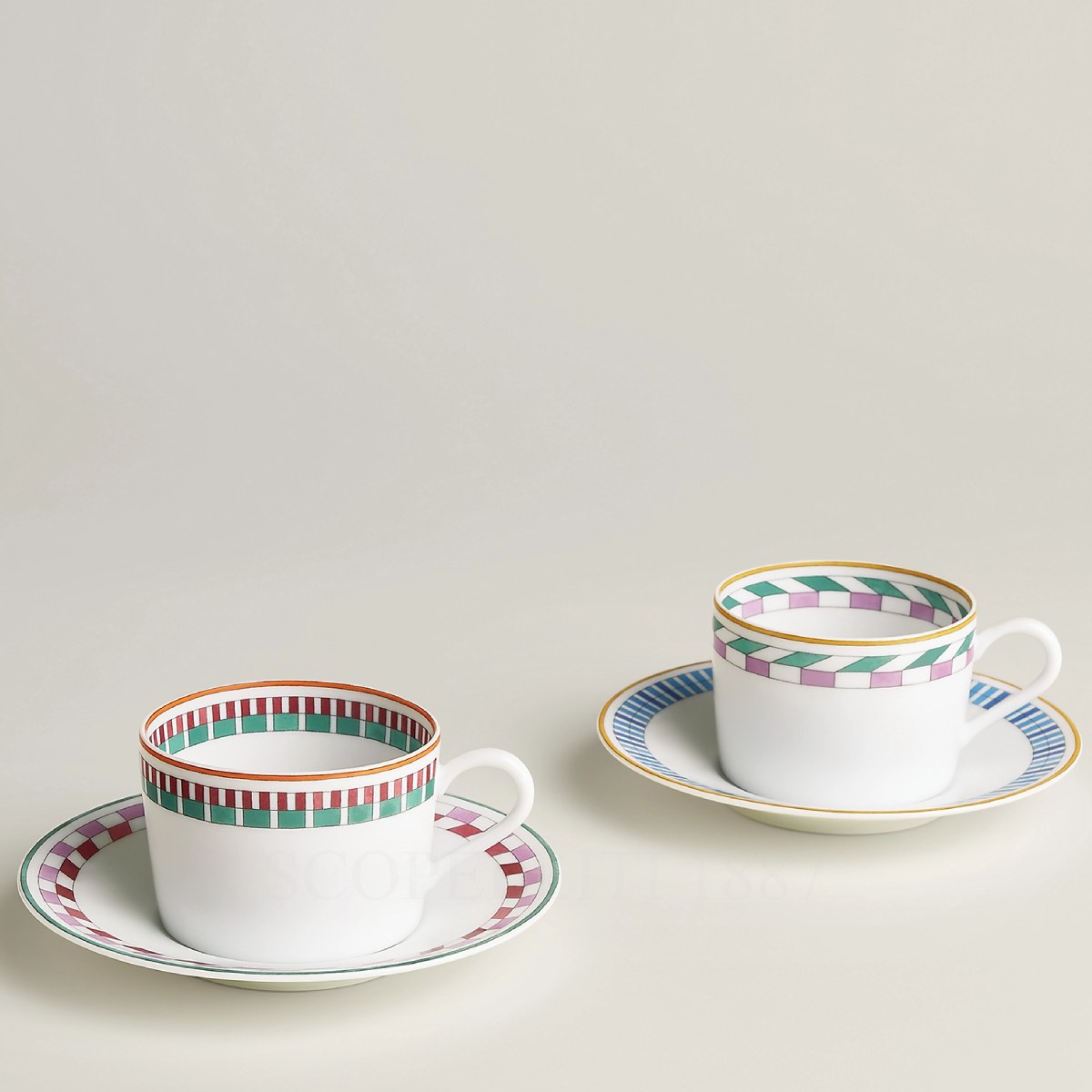 An elegant pairing of graphic expressions, Hermes en Contrepoint Set of 2 Tea Cups n.1 and n.2 unites an interplay of distinct chromatic friezes and layered motifs creates a sophisticated visual contrast, transforming the tea service into a curated design statement.