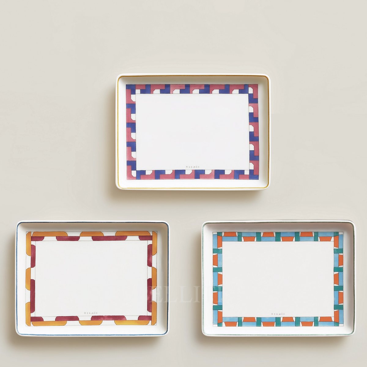 The Hermès en Contrepoint Set of 3 Small Trays brings modern harmony to everyday serving. Crafted from fine Limoges porcelain and enhanced with hand-applied chromolithography printing, this refined trio includes 1 small tray n.1, 1 small tray n.2, and 1 small tray n.3, each distinguished by its own unique frieze motif.
