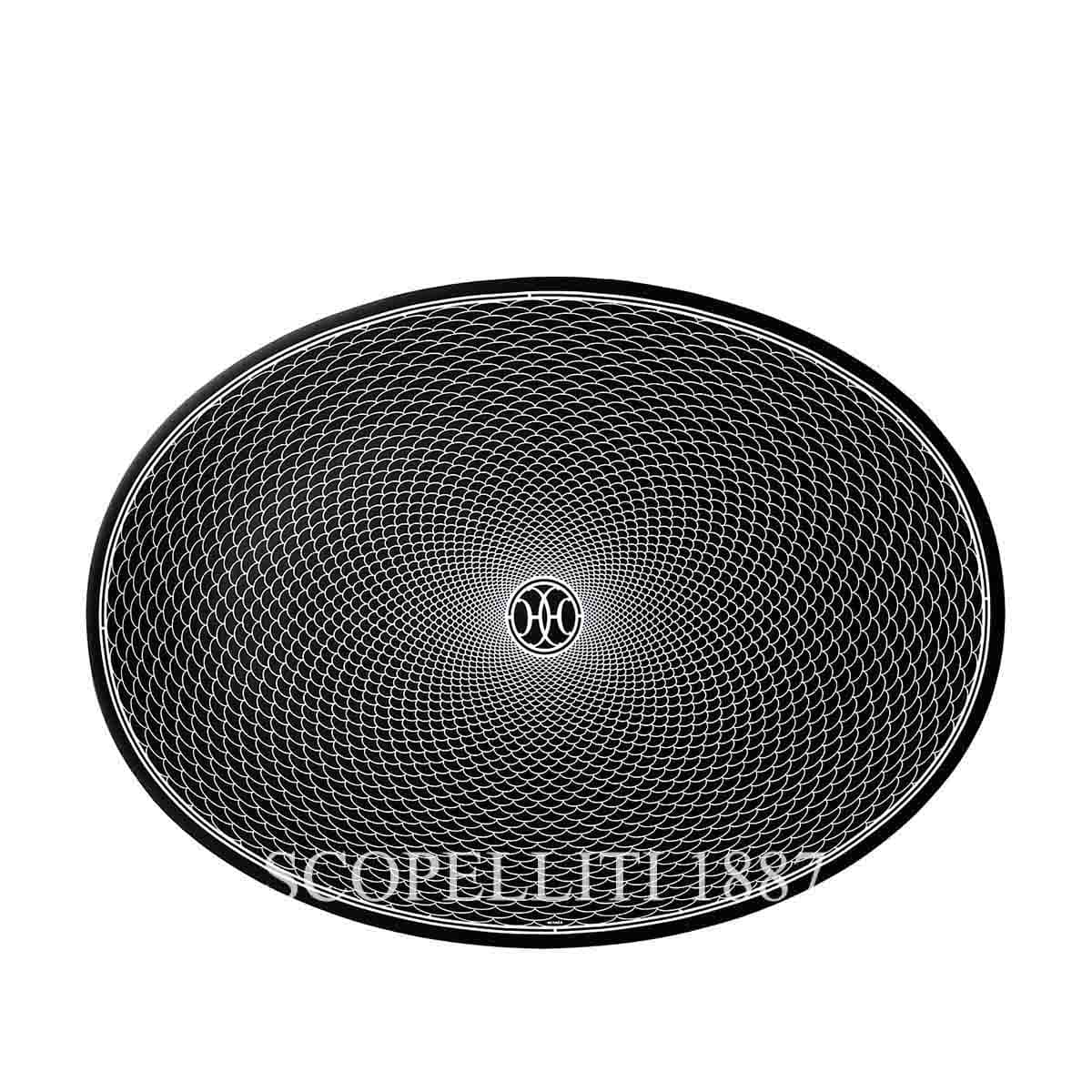 Hermès H Deco Medium Oval Platter in porcelain, complete with a Hermès gift box, Bolduc ribbon, and the iconic orange Hermès shopping bag. The design is inspired by the Art Deco ironwork seen in Hermès’ Parisian stores, specifically the 24 Faubourg Saint-Honoré location. The center of the plate showcases the double-H “Lift” motif, which is found on the store’s elevator and main door. This symbol represents the union of Emile Hermès and Julie Hollande in 1900, adding a rich historical connection to the design. This elegant Hermès plate is perfect for adding a touch of classy luxury to any table.
