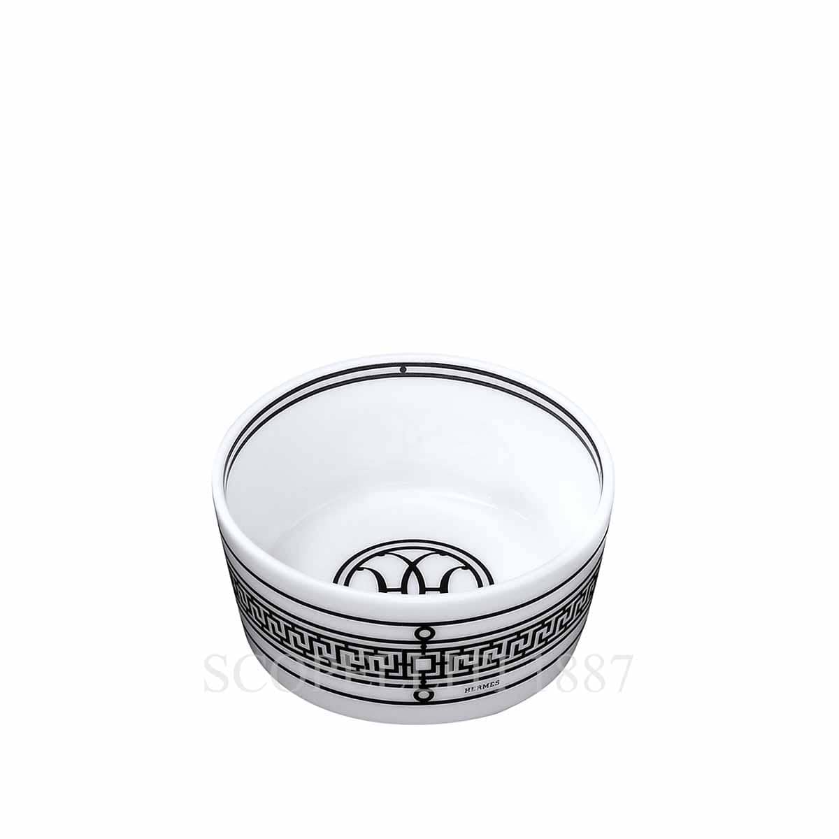 Hermès H Deco Small Coaster in porcelain, complete with a Hermès gift box, Bolduc ribbon, and the iconic orange Hermès shopping bag. The design is inspired by the Art Deco ironwork seen in Hermès’ Parisian stores, specifically the 24 Faubourg Saint-Honoré location. The center of the bowl showcases the double-H “Lift” motif, which is found on the store’s elevator and main door. This symbol represents the union of Emile Hermès and Julie Hollande in 1900, adding a rich historical connection to the design. This elegant Hermès coaster is perfect for adding a touch of classy luxury to any table.