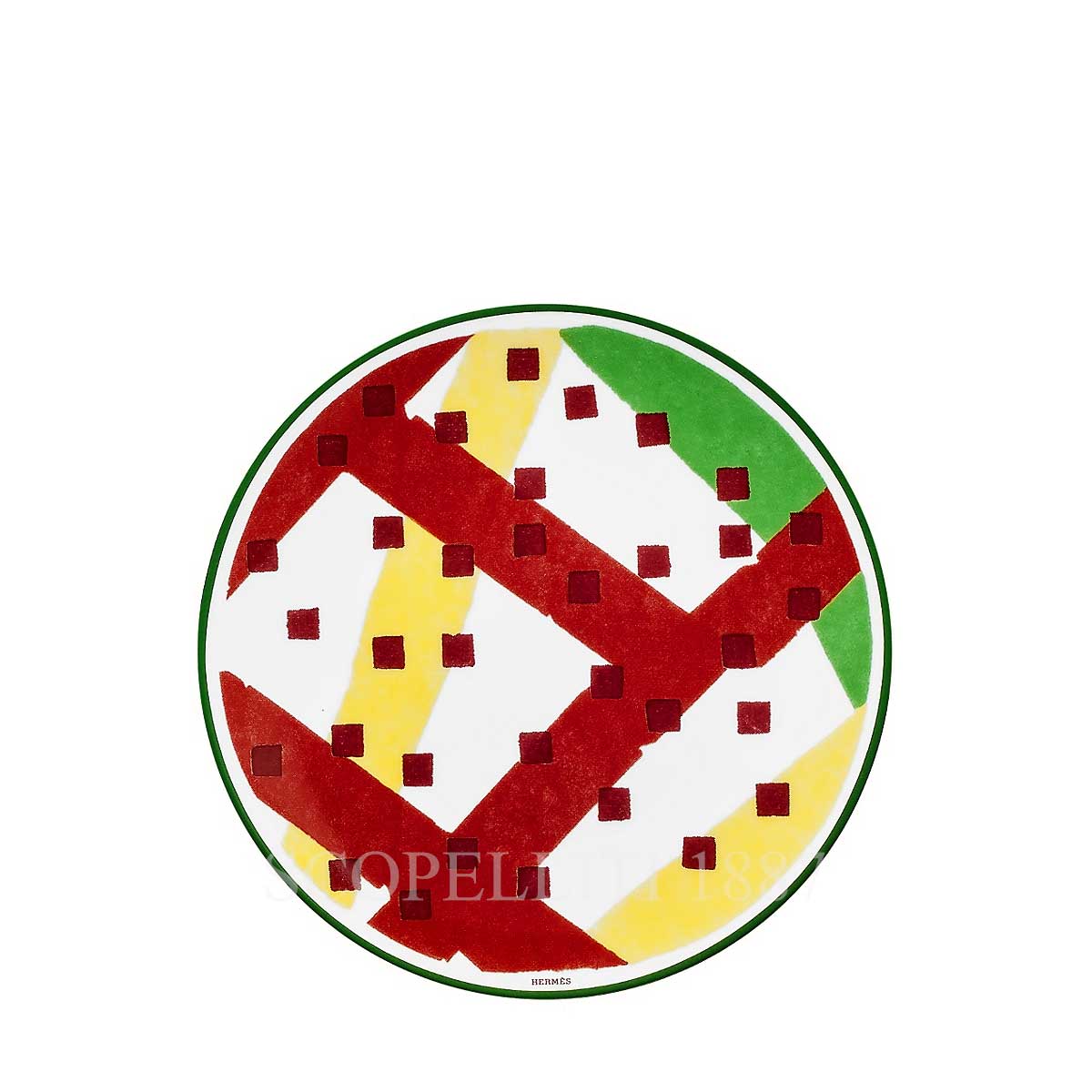 Hermes Hippomobile Bread plate n°2 in porcelain, complete with a Hermès gift box, Bolduc ribbon, and the iconic orange Hermès shopping bag. This Hermes plate features a bold and geometric design with red, green and yellow patterns highlighted by square accents in the same colors. The green rim adds a touch of elegance, balancing the playful and sophisticated elements of the design.