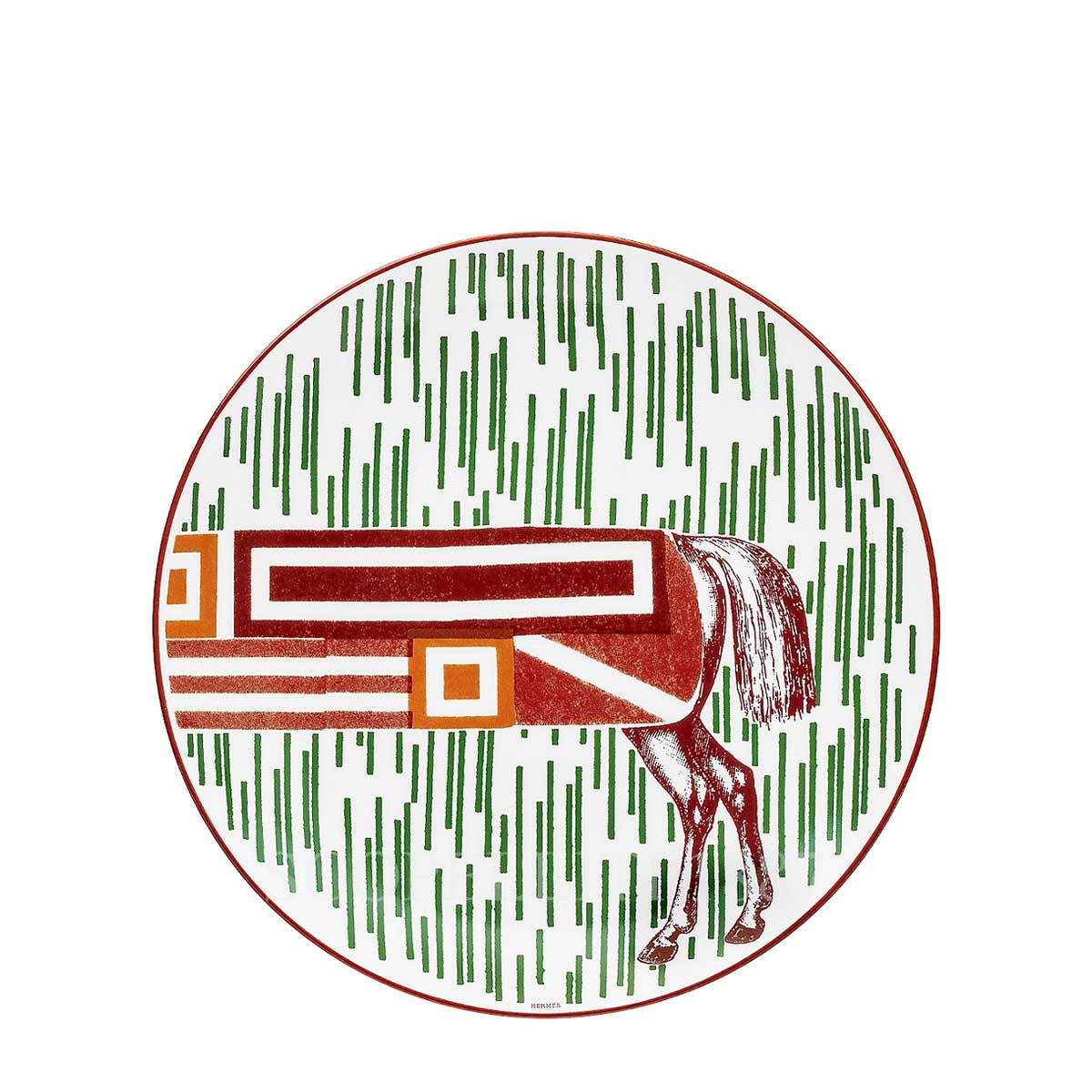 Hermes Hippomobile Dessert plate n°3 in porcelain, complete with a Hermès gift box, Bolduc ribbon, and the iconic orange Hermès shopping bag. This Hermes plate features a minimalist and artistic image of a horse back, partially covered with geometric red and orange patterns. The background is white with small green dashes, giving it a playful and contemporary feel. The design combines elements of abstract art, making it visually striking and unique.