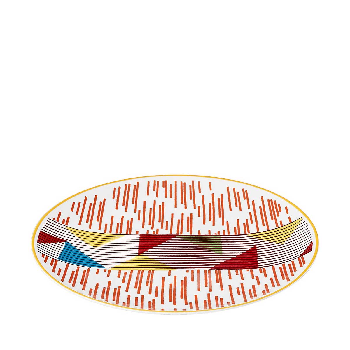 Hermes Hippomobile Dessert plate n°5 in porcelain, complete with a Hermès gift box, Bolduc ribbon, and the iconic orange Hermès shopping bag. This Hermes plate features a minimalist and artistic image of a horse back, partially covered with colorful geometric shapes in red, yellow, blue, and green, adding a vibrant touch. The background features a lively pattern of scattered orange dashes on a white surface, creating a sense of movement and energy. The yellow rim provides a subtle and refined frame, making it an eye-catching and playful addition to any table setting. Product details