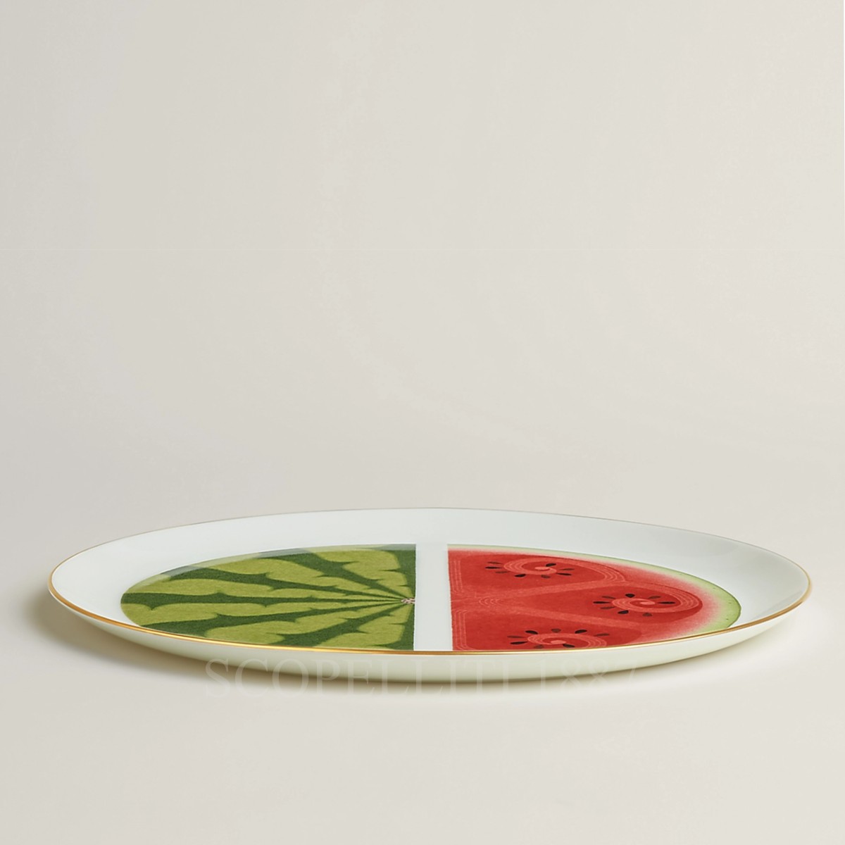 The Hermes Kaorumi Tart Platter Watermelon is a joyful centerpiece from the newest Hermes China collection that elevates your dessert presentations. Made in France and designed by Ryo Takemasa, this fine porcelain platter captures the essence of summer through a perfectly symmetrical and stylized slice of juicy watermelon. The vivid red flesh, black seeds, and bright green rind stand out against the pristine white porcelain background, creating a fresh and refined visual impact. This Hermès tart platter is ideal for serving cakes and fruit tarts in style. Each detail on Hermes Kaorumi Tart Platter Watermelon is applied using the chromolithography technique, and the rim is finished with a hand-painted 24-karat gold trim, adding a luxurious touch to an already elegant piece.
