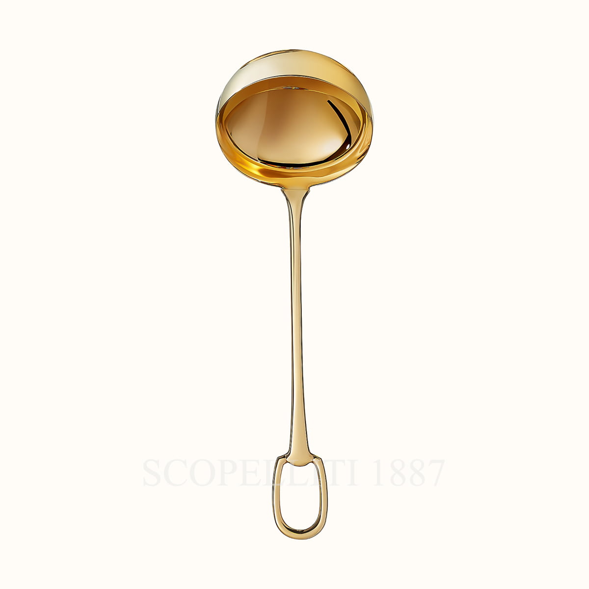 The Hermes Ladle Grand Attelage Gold-Plated seamlessly merges timeless elegance with exceptional craftsmanship. Inspired by Hermès’ rich equestrian heritage, this exquisite piece embodies sophistication, making it a statement addition to any refined table setting. The Hermes Ladle Grand Attelage Gold-Plated comes beautifully presented in an elegant Hermès gift paper bag, adorned with the signature Bolduc ribbon and accompanied by the iconic orange Hermès shopping bag, making it a perfect gift or collector’s piece. Expertly crafted from premium silver-plated metal, the Hermes Ladle Grand Attelage Gold-Plated radiates a lustrous sheen, elevating both everyday dining and formal occasions. The ergonomically balanced handle, reminiscent of the saddle key used in traditional horse-drawn carriages, ensures comfort and grace with every use. Designed for those who appreciate luxury tableware, this gold-plated ladle reflects the finest artistry in contemporary cutlery.