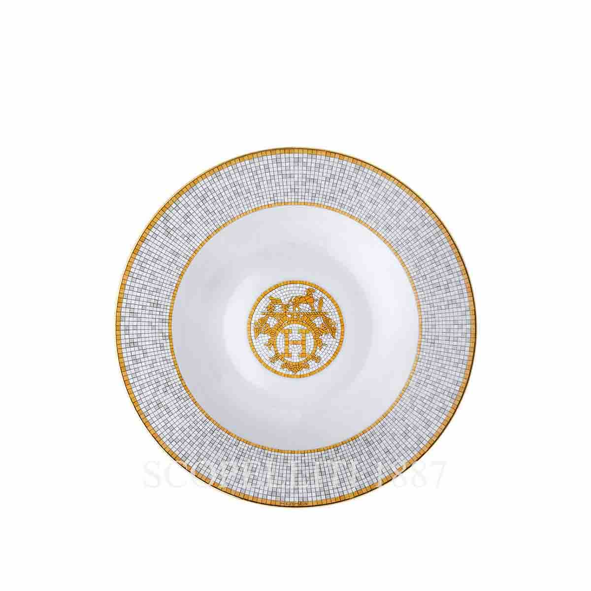 The Hermès Mosaique au 24 Soup Plate features hand-applied mosaics made from 24-carat platinum tiles, creating intricate, screen-printed patterns. Designed by Benoit Pierre Emery, these dishes are inspired by the elegant décor of the Hermès flagship store at 24 Faubourg Saint-Honoré in Paris. The design combines glossy and matte tiles to mimic the store’s mosaic floor, featuring Greek motifs and a flowing, wave-like effect. Blending Greek and Art Deco influences, the Hermès Mosaique au 24 Soup Plate beautifully reflects the brand’s heritage and the timeless elegance of its Parisian roots.