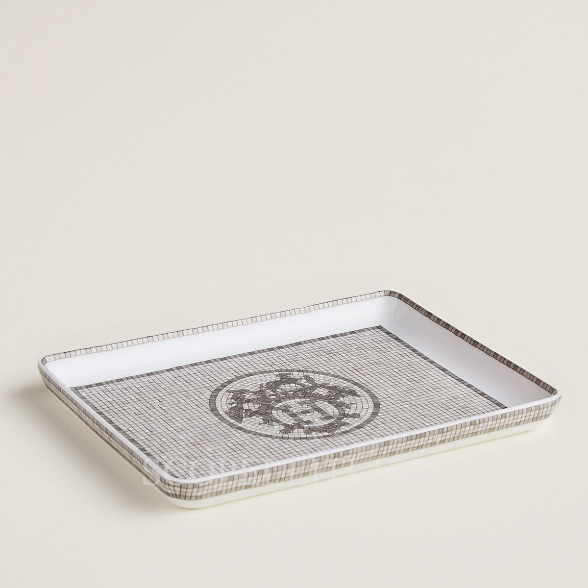 This gorgeous Hermès Mosaique au 24 Sushi Plate in porcelain features decorative mosaics that are screen-printed and hand-applied using 24-carat platinum tiles. Designed by Benoit Pierre Emery, the geometric pattern in the Mosaique au 24 Platinum collection reflects the original décor of 24 Faubourg Saint-Honoré in Paris. The design combines glossy and matte tiles to mimic the store’s mosaic floor, featuring Greek motifs and a flowing, wave-like effect. Blending Greek and Art Deco influences, the Hermès Mosaique au 24 Sushi Plate beautifully reflects the brand’s heritage and the timeless elegance of its Parisian roots.