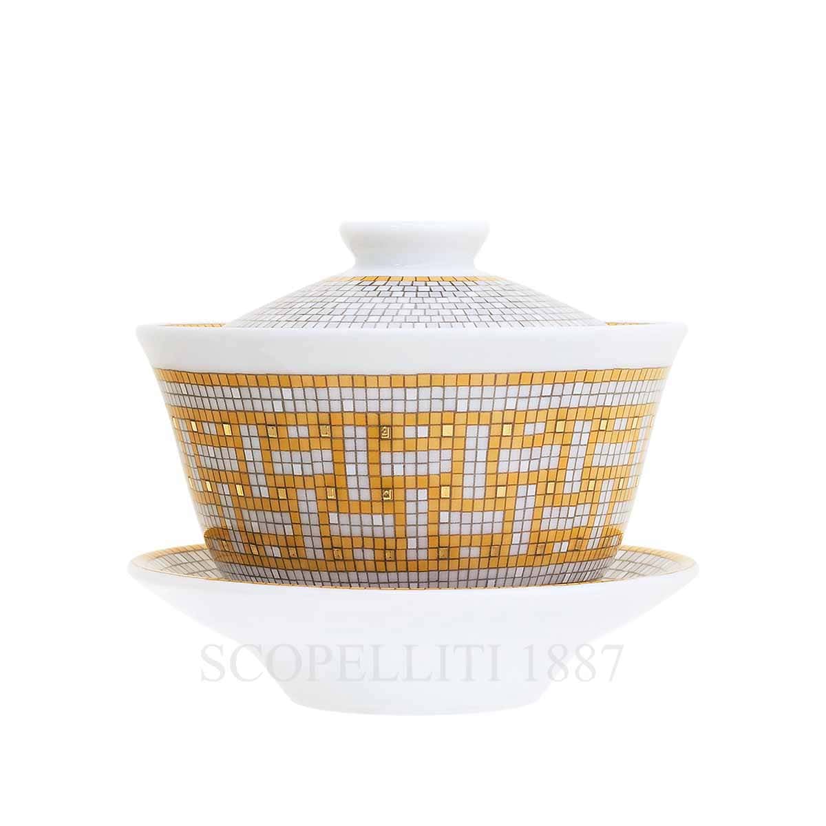 Although the Hermès Mosaique Gold dinnerware can be washed in the dishwasher occasionally, hand washing with a non-abrasive sponge is recommended to preserve its beauty and luster. The pieces are not microwave-safe due to their precious materials.