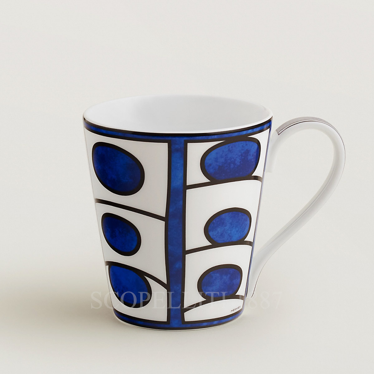 The Hermès Bleus d’Ailleurs Mug N°1 in Limoges porcelain features refined cobalt‑blue and white motifs — perfect for enjoying tea, coffee, or warm beverages in sophisticated table settings.