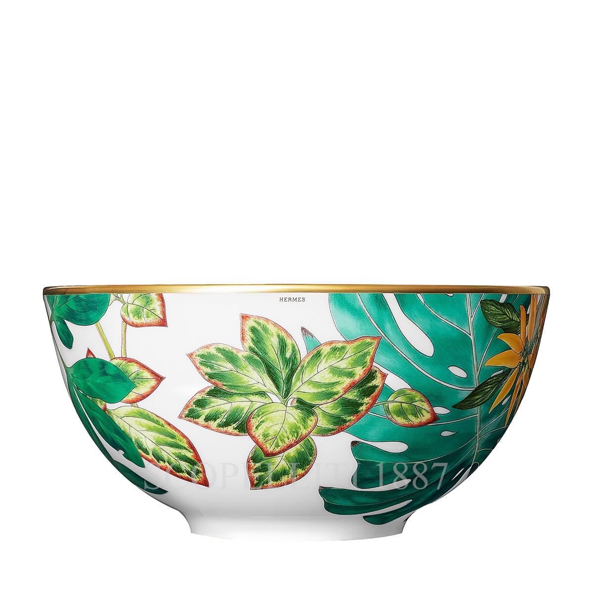 Hermes Passifolia Bowl Large is made of porcelain with screen-printed decorations, carefully applied by hand with a brush. This porcelain Hermes bowl has a colorful design of a tropical plants. A thin gold rim that surrounds the edge of the bowl, adds an elegant touch.