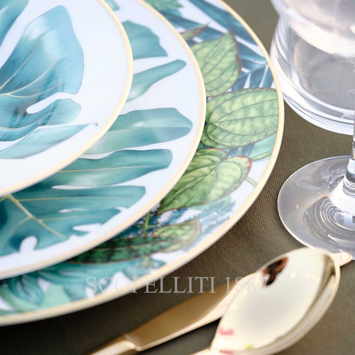 Hermes Passifolia Dinner plate Philodendron is made of porcelain with screen-printed decorations and a 24-carat gold finish, carefully applied by hand with a brush. This round porcelain Hermes plate has a colorful design of a big tropical philodendron. The design is detailed, with a thin gold rim surrounds the edge of the plate, adding an elegant touch.