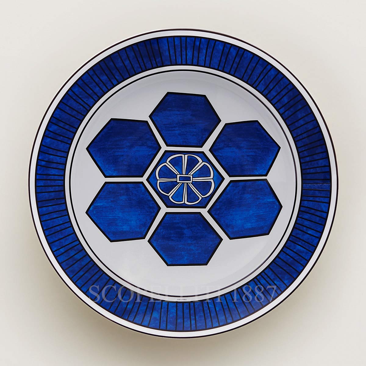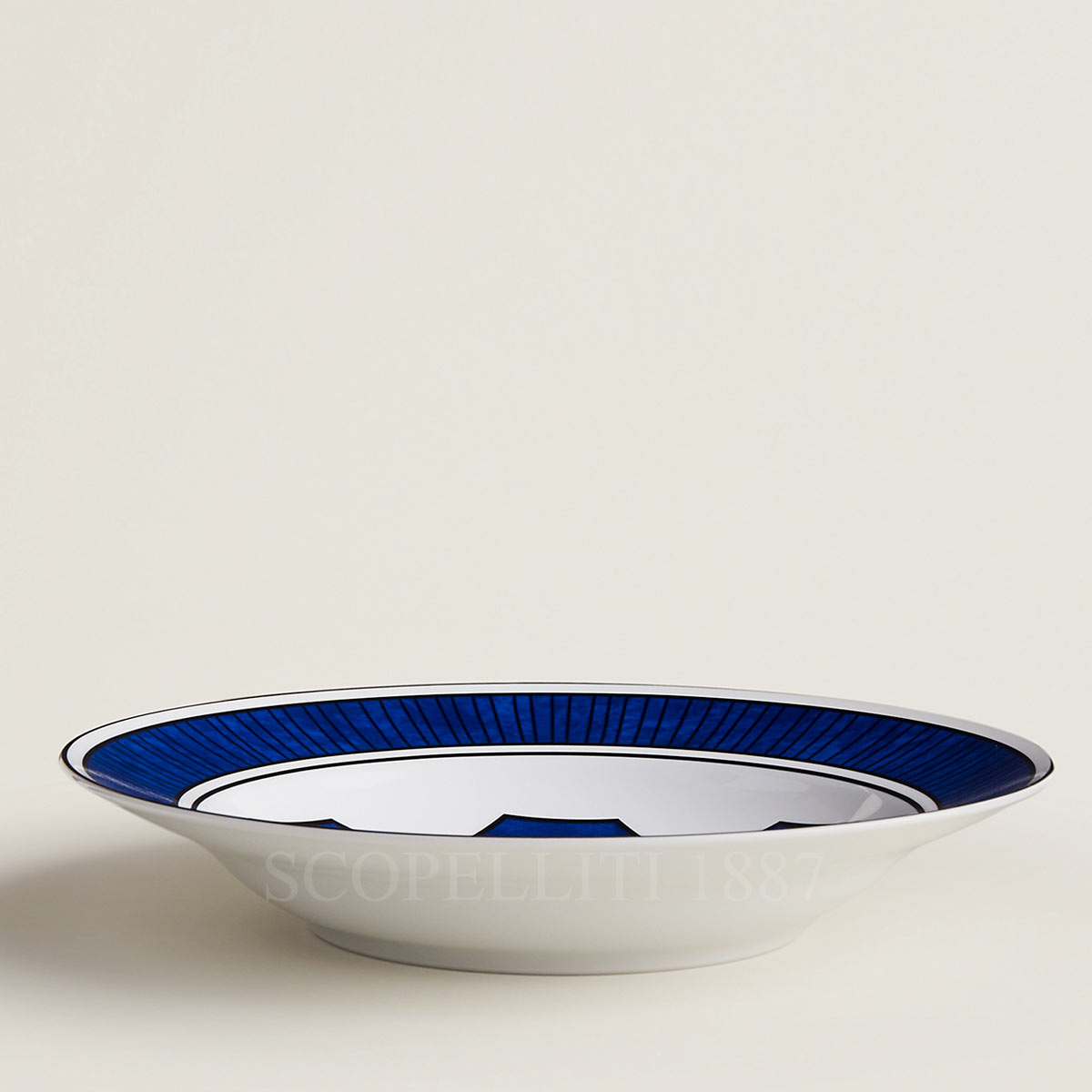 The Hermès Bleus d’Ailleurs Round Deep Platter is a luxurious serving piece crafted from French Limoges porcelain, featuring the collection’s signature cobalt‑blue geometric motifs designed by Arielle de Brichambaut. This deep round shape offers functional versatility, making it perfect for serving salads, pastas, antipasti, or shared dishes during refined meals.