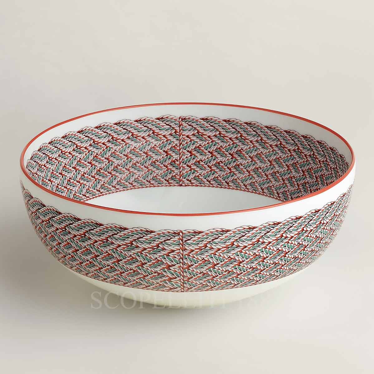 Hermes Salad Bowl Tressages Equestres Medium continues the collection’s signature equestrian-inspired aesthetic, featuring an intricate braided design that mimics finely woven leather. A thin red border outlines the plate, adding a refined and understated elegance. The blend of textures and colors reflects Hermès’ expertise in luxury design, making this piece a sophisticated addition to any dining set. Perfect for complementing the matching dinnerware, this Hermes Salad Bowl Tressages Equestres Medium embodies artistry and functionality.