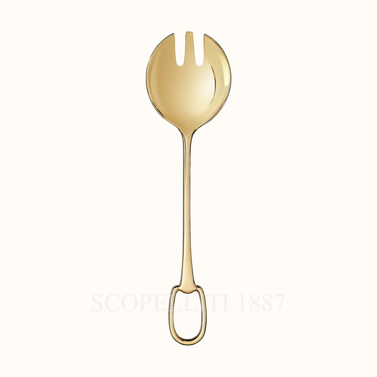 The Hermes Salad Serving Fork Grand Attelage Gold-Plated seamlessly merges timeless elegance with exceptional craftsmanship. Inspired by Hermès’ rich equestrian heritage, this exquisite piece embodies sophistication, making it a statement addition to any refined table setting. The Hermes Salad Serving Fork Grand Attelage Gold-Plated comes beautifully presented in an elegant Hermès gift paper bag, adorned with the signature Bolduc ribbon and accompanied by the iconic orange Hermès shopping bag, making it a perfect gift or collector’s piece. Expertly crafted from premium silver-plated metal, the Hermes Salad Serving Fork Grand Attelage Gold-Plated radiates a lustrous sheen, elevating both everyday dining and formal occasions. The ergonomically balanced handle, reminiscent of the saddle key used in traditional horse-drawn carriages, ensures comfort and grace with every use. Designed for those who appreciate luxury tableware, this gold-plated serving fork reflects the finest artistry in contemporary cutlery.