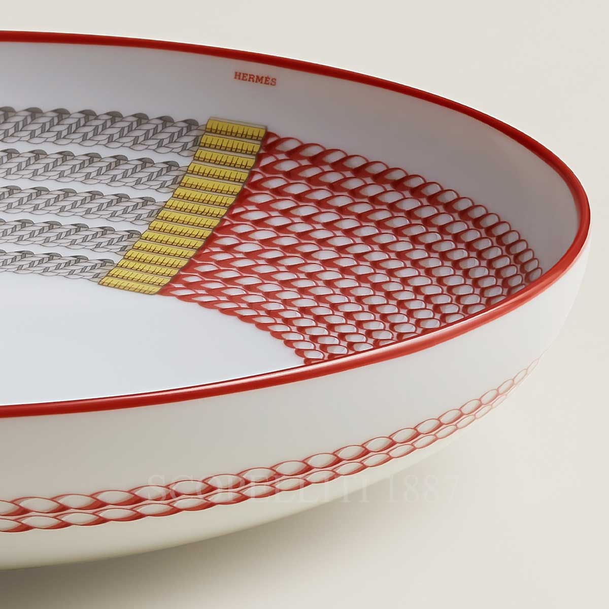 Hermes Soup Plate Tressages Equestres continues the collection’s signature equestrian-inspired aesthetic, featuring an intricate braided design that mimics finely woven leather. The circular motif, which adorns the rim, is a combination of neutral gray and warm red tones, with accents of yellow and blue that enhance the detailed craftsmanship. A thin red border outlines the plate, adding a refined and understated elegance. The blend of textures and colors reflects Hermès’ expertise in luxury design, making this piece a sophisticated addition to any dining set. Perfect for complementing the matching dinnerware, this Hermes Soup Plate Tressages Equestres embodies artistry and functionality.