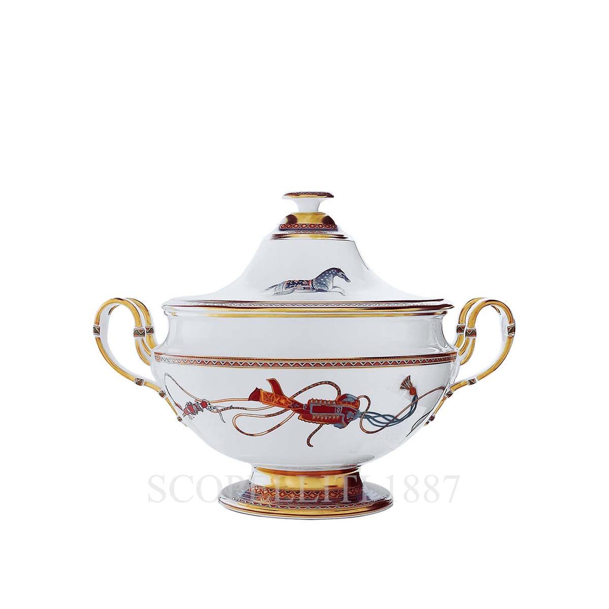 The Hermes Soup Tureen Cheval d’Orient is made of porcelain with a detailed screen-printed decoration applied by hand. It has a white base color with detailed designs and golden accents. The lid of the tureen features a small illustration of a galloping horse and has a golden knob at the top. The body of the tureen is adorned with beautiful images, including a horse-riding equipment such as whips or reins, depicted in brown and red colors. Gold detailing is present on the edges, handles, and base, adding a luxurious touch to the overall design. The two side handles are elegantly curved and also trimmed in gold.