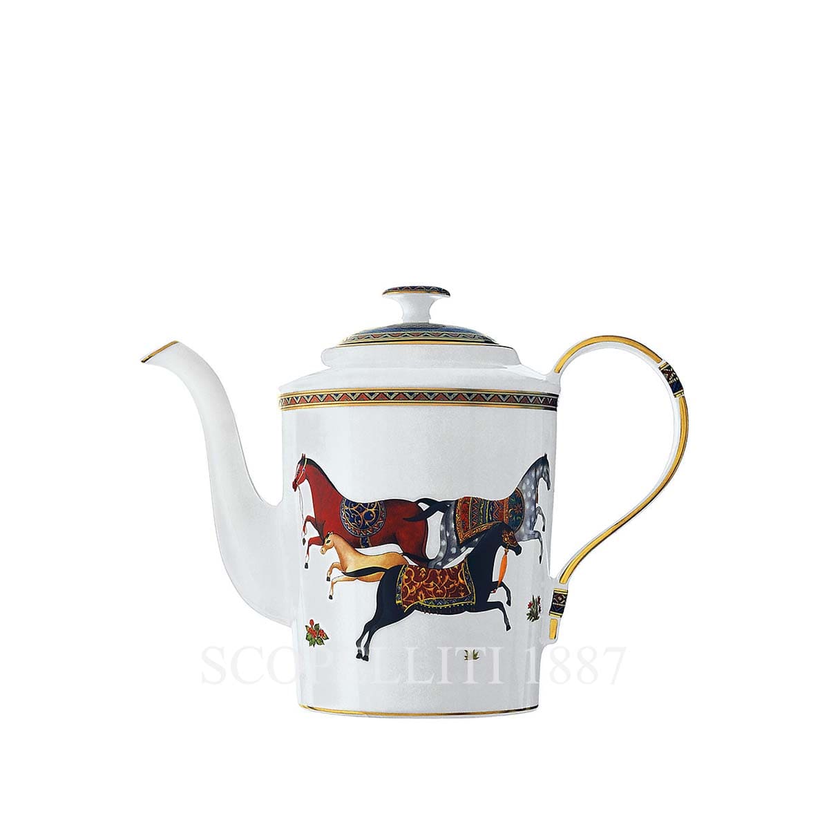The Hermes Teapot Cheval d’Orient has a white background, with colorful, decorated horses. The teapot has a curved handle and a long spout. The rims of the teapot are lined with 24 karat gold, adding a fancy touch. The overall style looks artistic and luxurious.