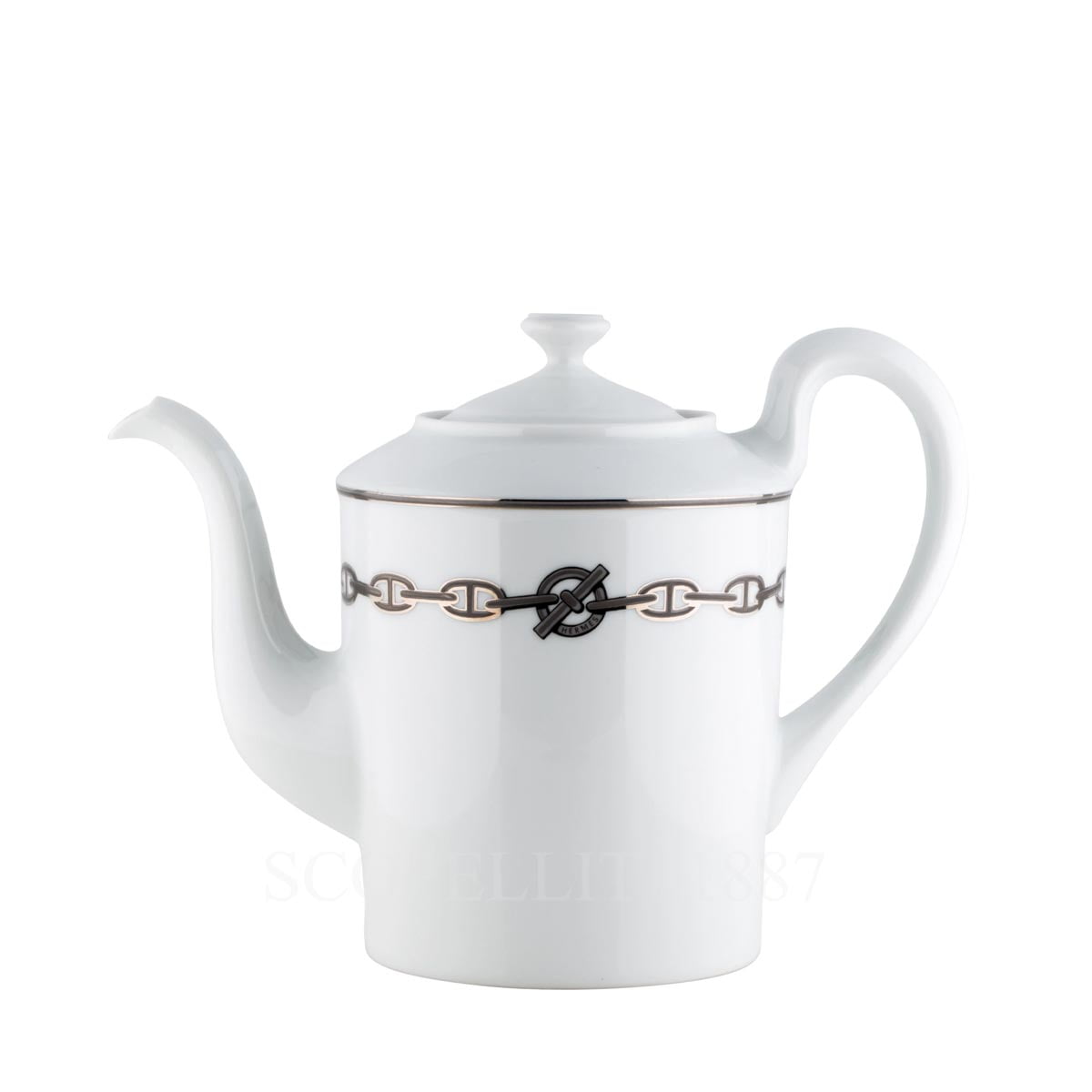 Hermes Chaine d’ancre platinum Teapot in Limoges porcelain. Gift box included. Capacity: 150 cl The harmonious combination of classic, laconic shapes, snow-white finest porcelain and daring patterns will make your serving truly memorable. The Chaine d’Ancre Platine tableware collection was inspired by a line of exclusive luxury accessories created and released earlier by Hermès. In particular, is reminiscent to the silver bracelet first appeared in 1938 and made the brand famous. Each item has a laconic but quite innovative look. A massive silver anchor chain frame adorns every single piece of this exceptional collection.