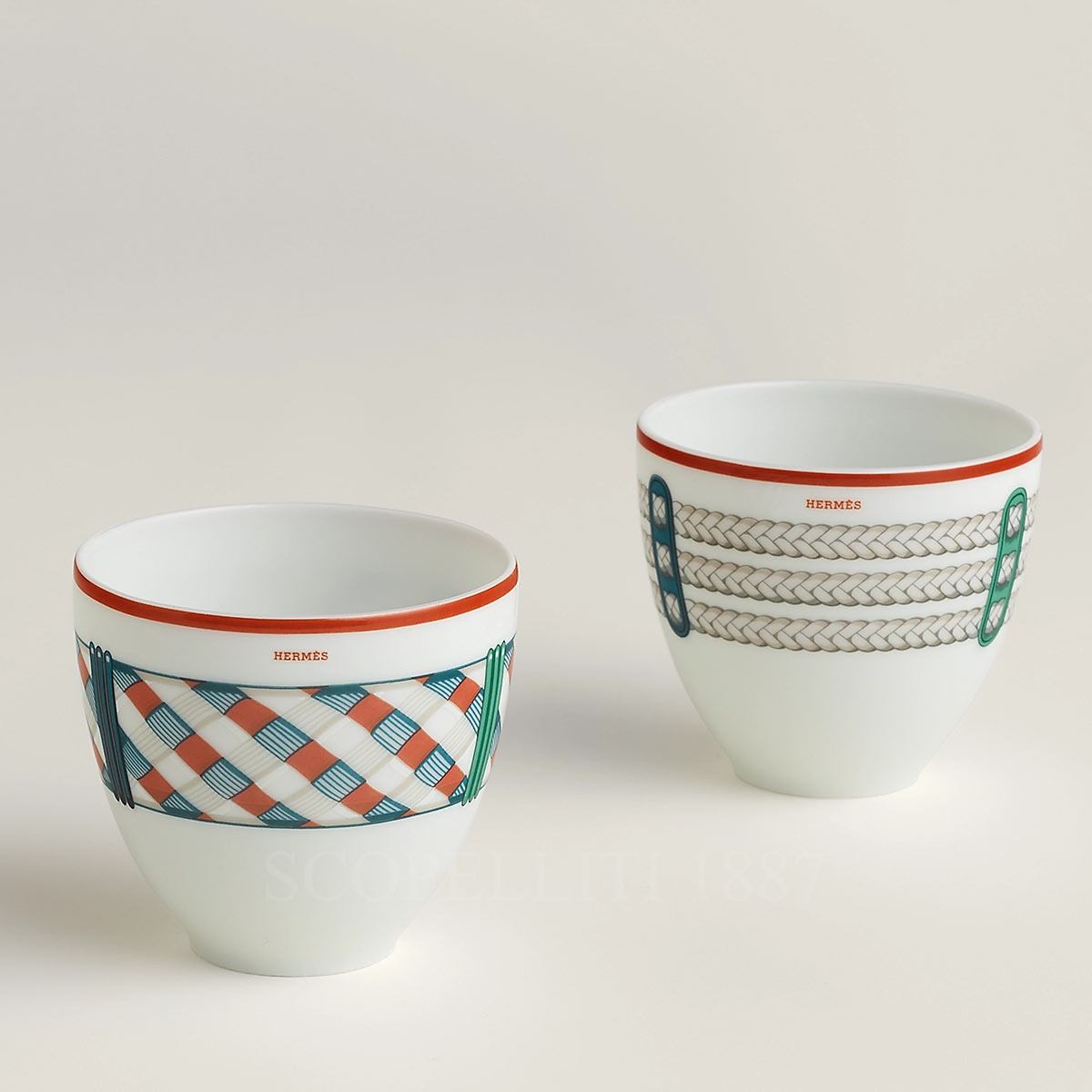 Enjoy your favorite drinks in style with the Hermes Tressages Equestres Small Tumblers. This set of two porcelain tumblers features elegant, equestrian-inspired designs that bring a subtle touch of luxury to your table—whether you’re serving water, wine, or something a little stronger. Each tumbler is part of the beautiful Tressages Équestres collection, designed by Virginie Jamin. The patterns are all slightly different, inspired by the detailed braids and trimmings once used in Hermès’ original harness-making days. The Tressages Equestres set offers an unexpected glimpse into the equestrian sphere, highlighting the details of harnesses and passementeries. The original pen and gouache drawing dresses the 27 pieces – including 10 new hollow shapes – for the lunch, dinner and tea/coffee collection