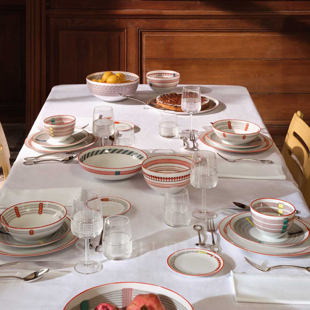 The Hermès Tumbler Tressages Équestres Large embodies the timeless artistry of the Maison. Its bold motif depicting a sophisticated knot created from interlacing leather-like straps pays tribute to Hermès’ deep equestrian roots, where craftsmanship and elegance intertwine. The design is dominated by rich, warm red tones that evoke the texture of finely polished leather. A refined red border along the rim enhances the tumbler’s silhouette, giving it a perfectly balanced and harmonious presence. Crafted from premium white porcelain and decorated through chromolithography, every detail reflects precision, depth, and the unmistakable Hermès aesthetic. With its generous 24 cl capacity, this large tumbler is ideal for water, juice, cocktails, or contemporary table styling. Its smooth lines and vibrant design make it a versatile piece that complements casual and sophisticated settings, while harmonizing beautifully with the entire Tressages Équestres dinnerware collection. Presented in the iconic Hermès orange box, complete with the signature Bolduc ribbon and the Maison’s shopping bag, the Hermès Tumbler Tressages Équestres Large is a distinguished gift and a timeless addition to any luxury porcelain collection.